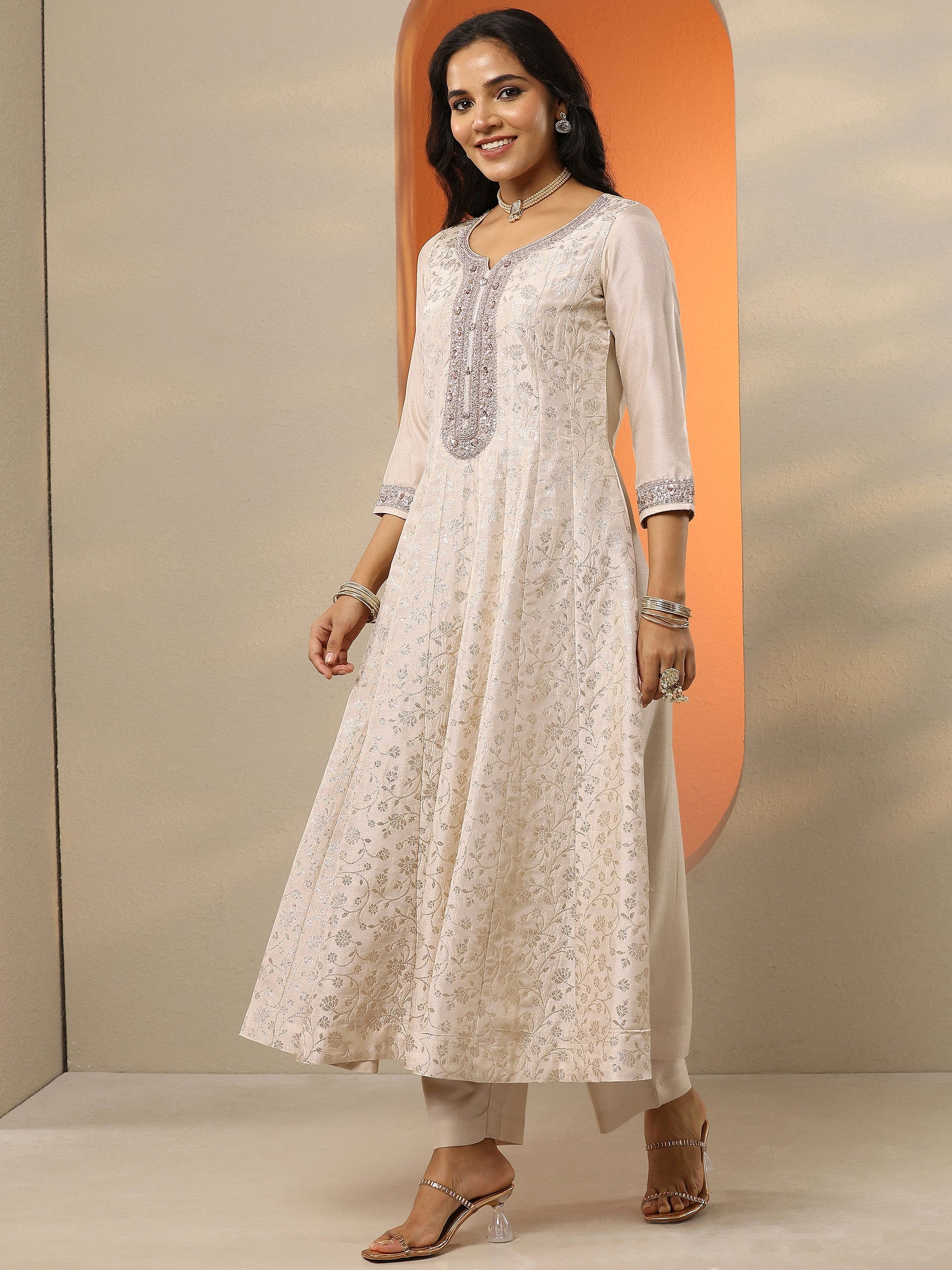 Libas Art Off White Woven Design Silk Blend Anarkali Suit Set With Dupatta