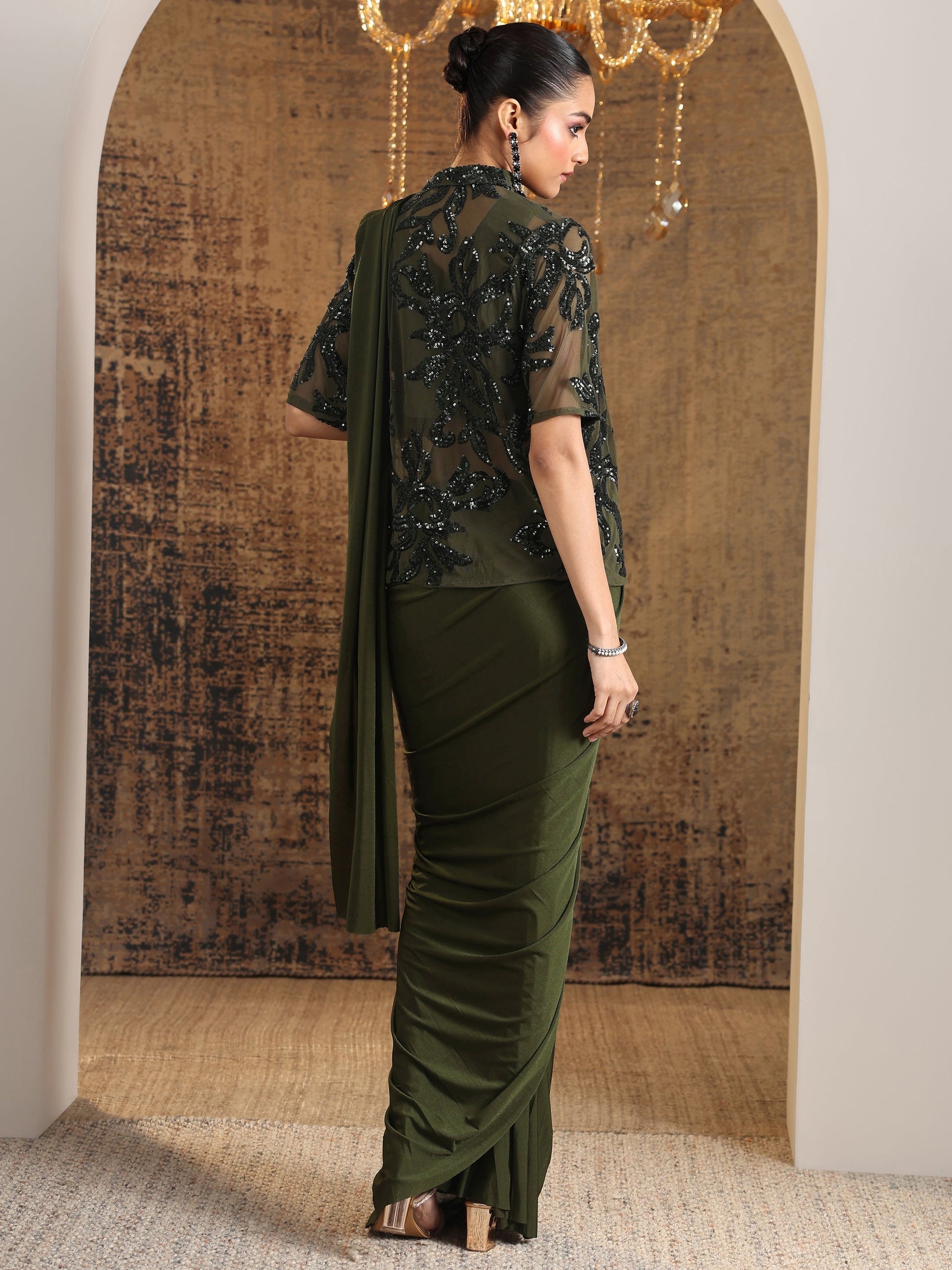 Libas Art Olive Solid Nylon Ready to Wear Saree