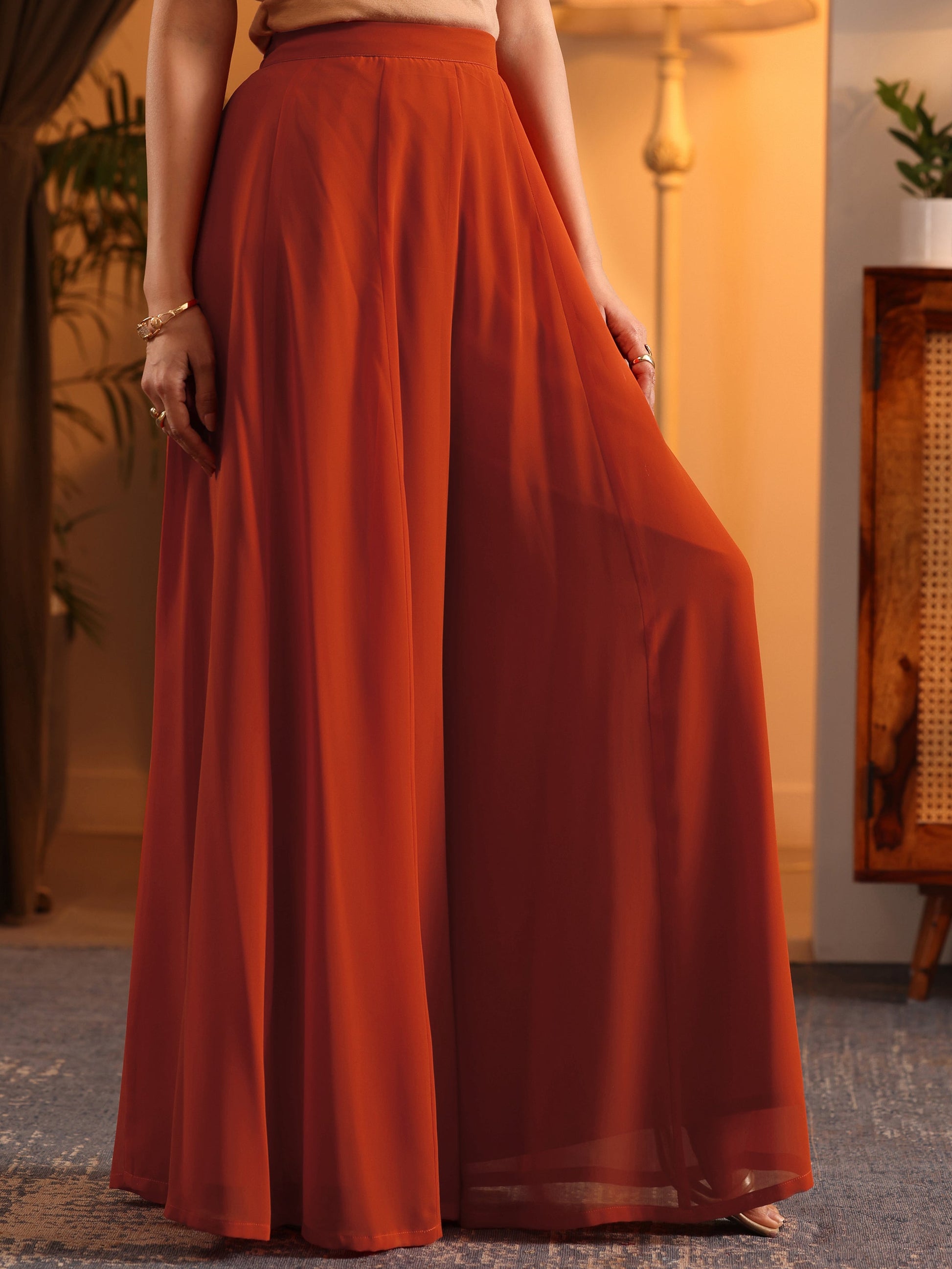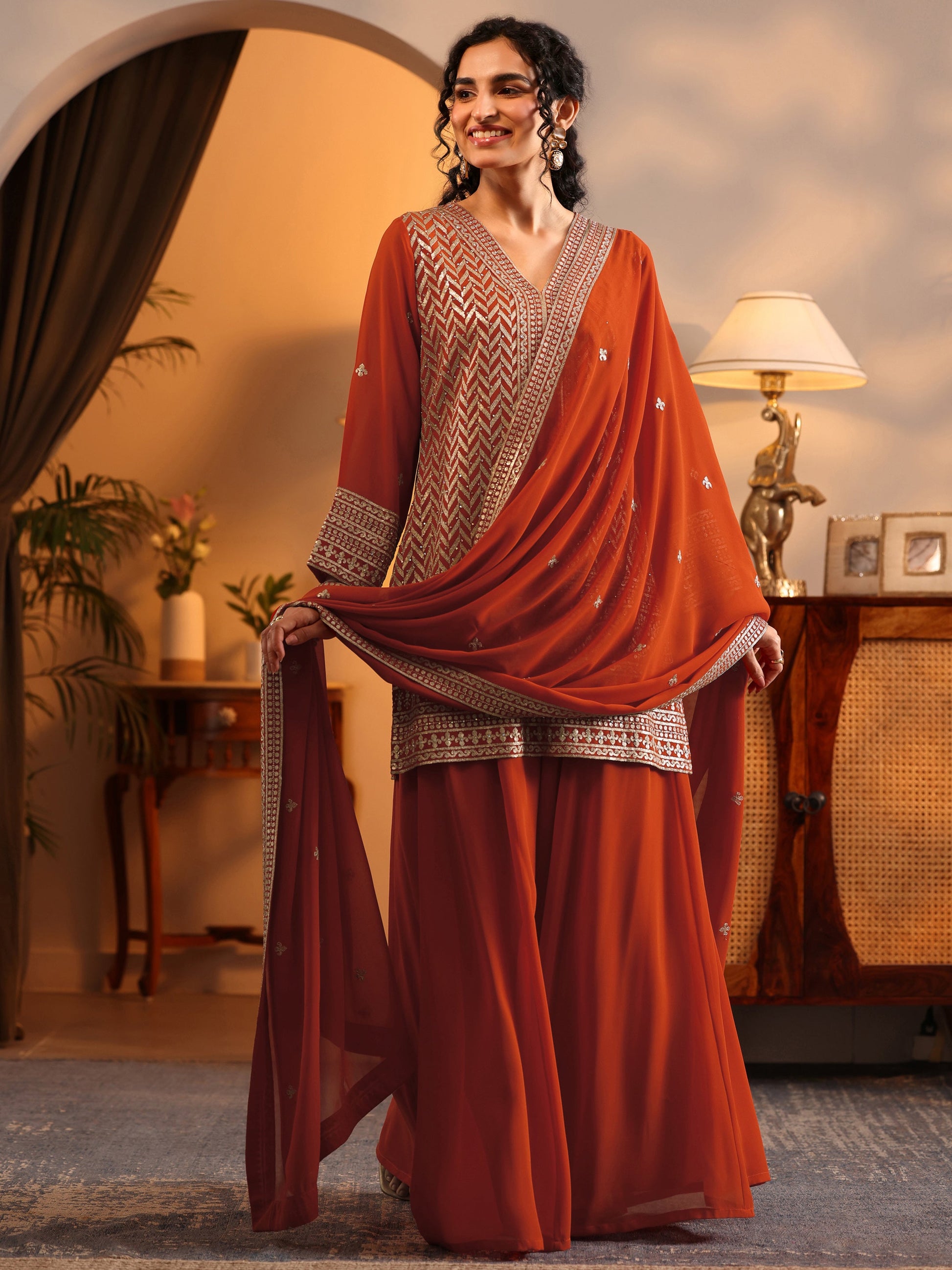 Our 3-piece orange georgette kurta set features a straight-fit kurta with a V-neckline, regular sleeves, and statement yoke. Complemented with lining and palazzo pants with a partially elasticated waistband and 2 pockets, and an embroidered dupatta. Adorned with embroidered embellishments, this style is perfect for festive wear.