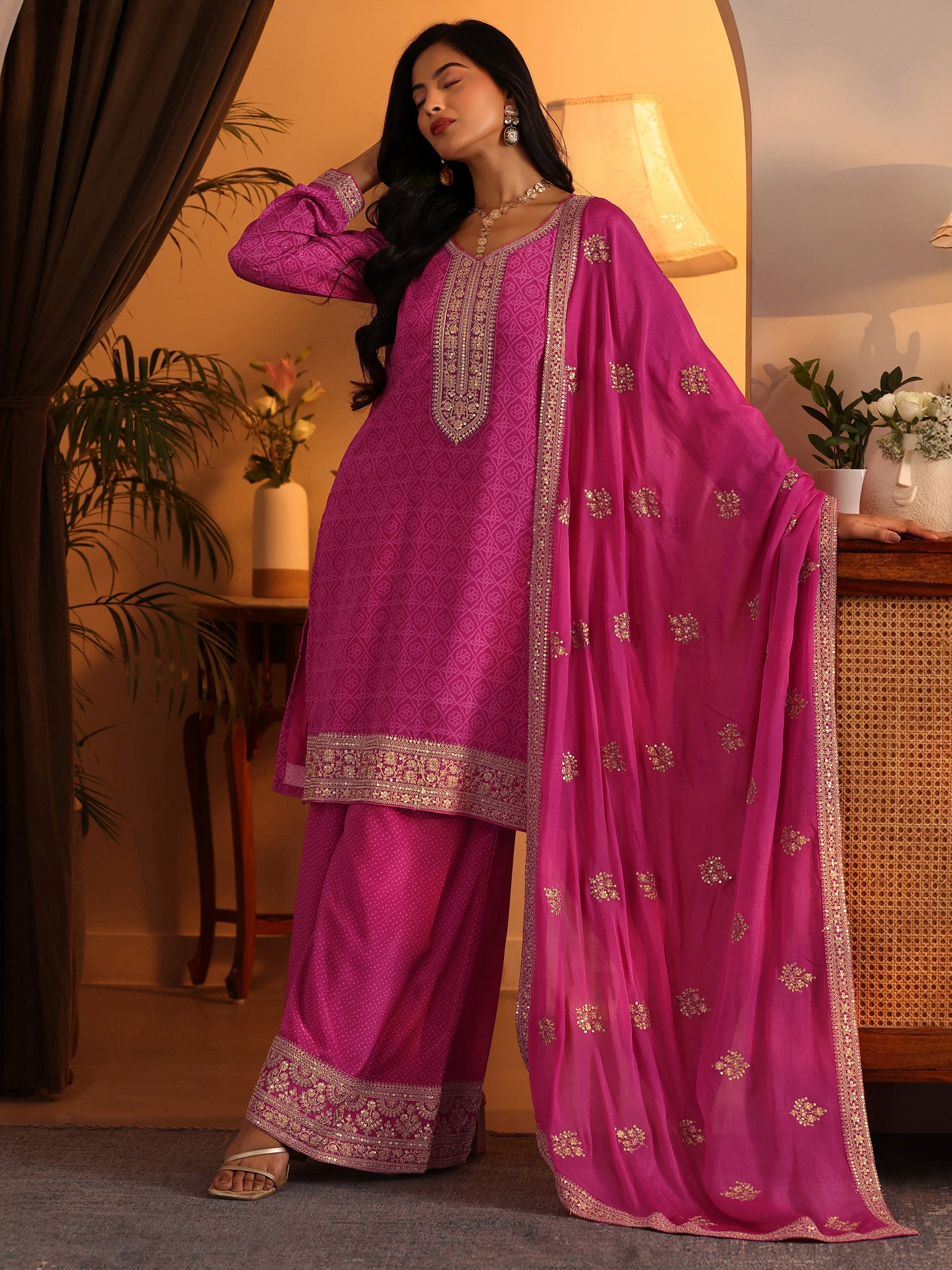 Our 3-piece Pink Chinon Straight-fit Kurta Set features a Round Neckline, Regular Sleeves, and statement yoke. Complemented with Lining and Palazzo Pants with a Partially Elasticated waistband, and an Embroidered dupatta. Adorned with Embroidered accents, this style is perfect for Festive wear.