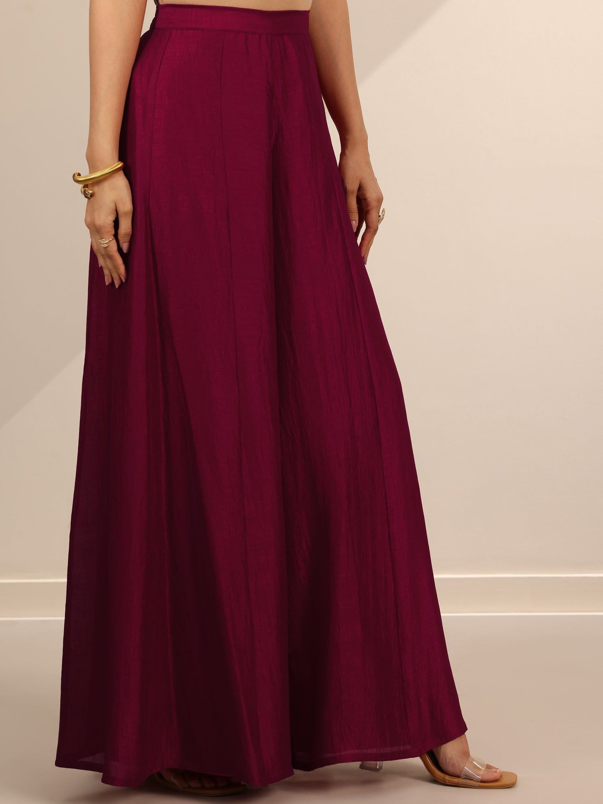 Our 3-piece maroon silk blend kurta set features a straight-fit kurta with a V-neckline, comfortable full sleeves, and a statement yoke. Complemented with palazzo pants with an elasticated waistband, and an embroidered dupatta. Adorned with embroidered accents, this style is perfect for dark festive occasions.