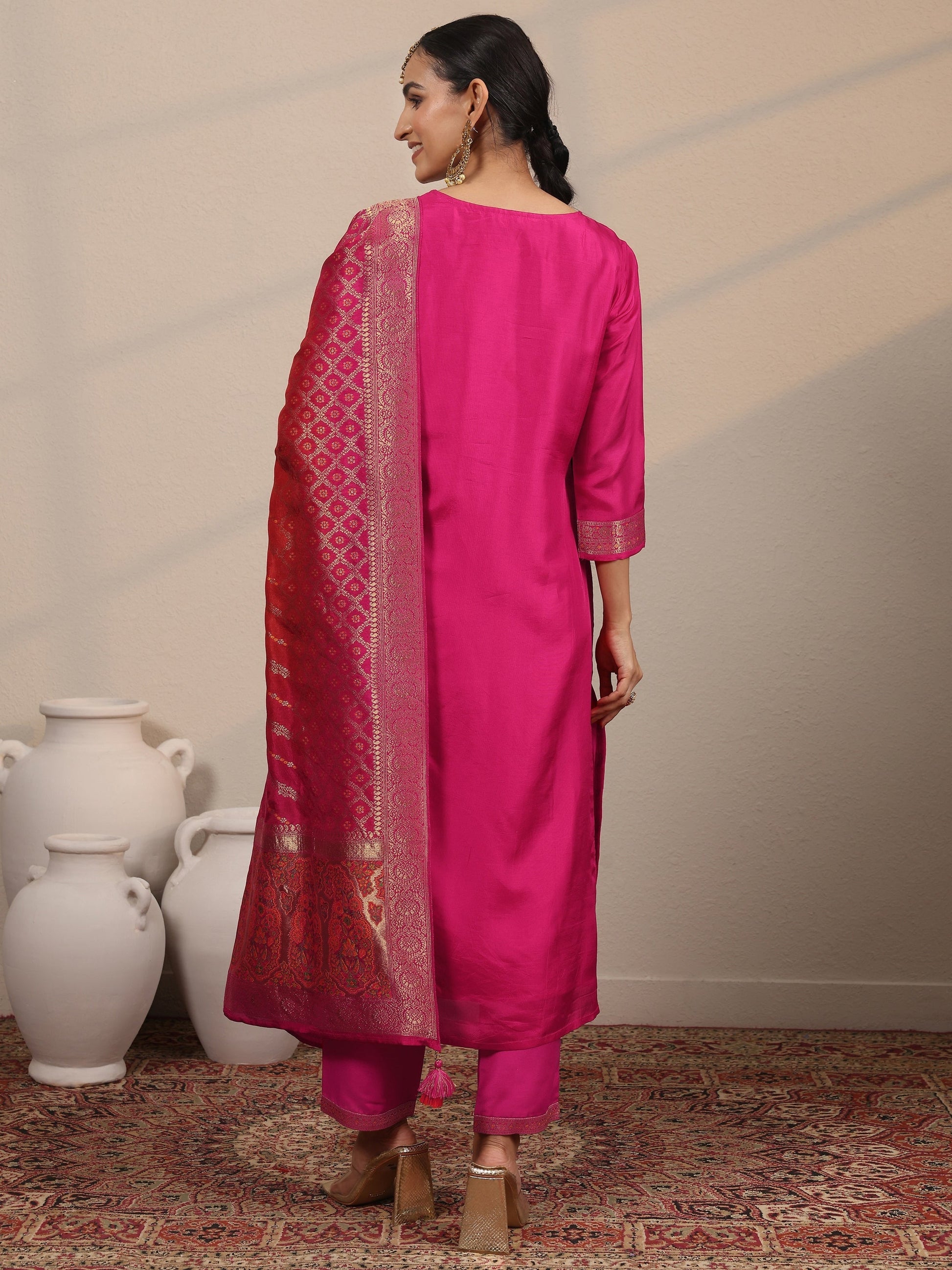 Libas Art Pink Woven Design Silk Blend Straight Suit Set With Dupatta