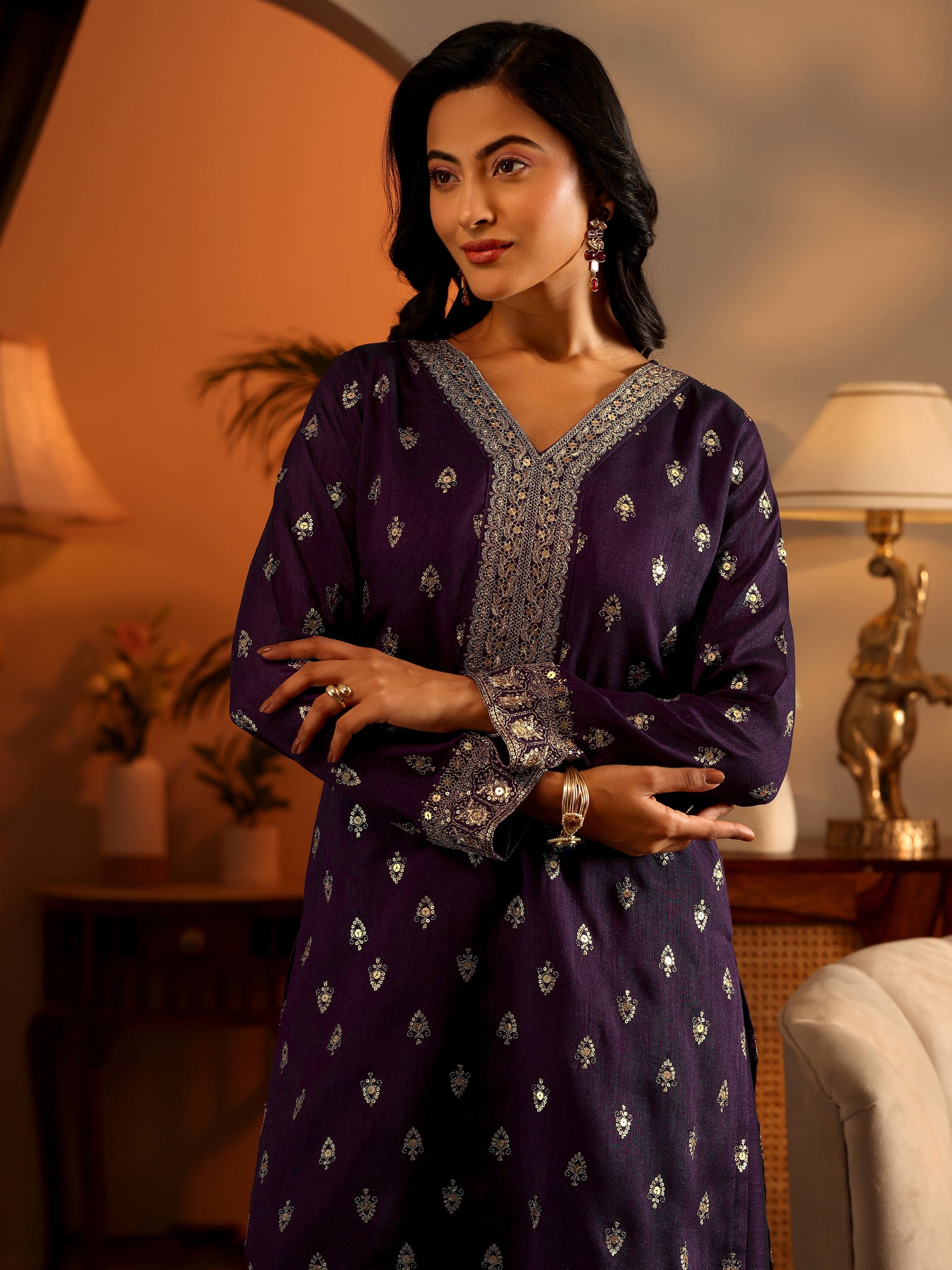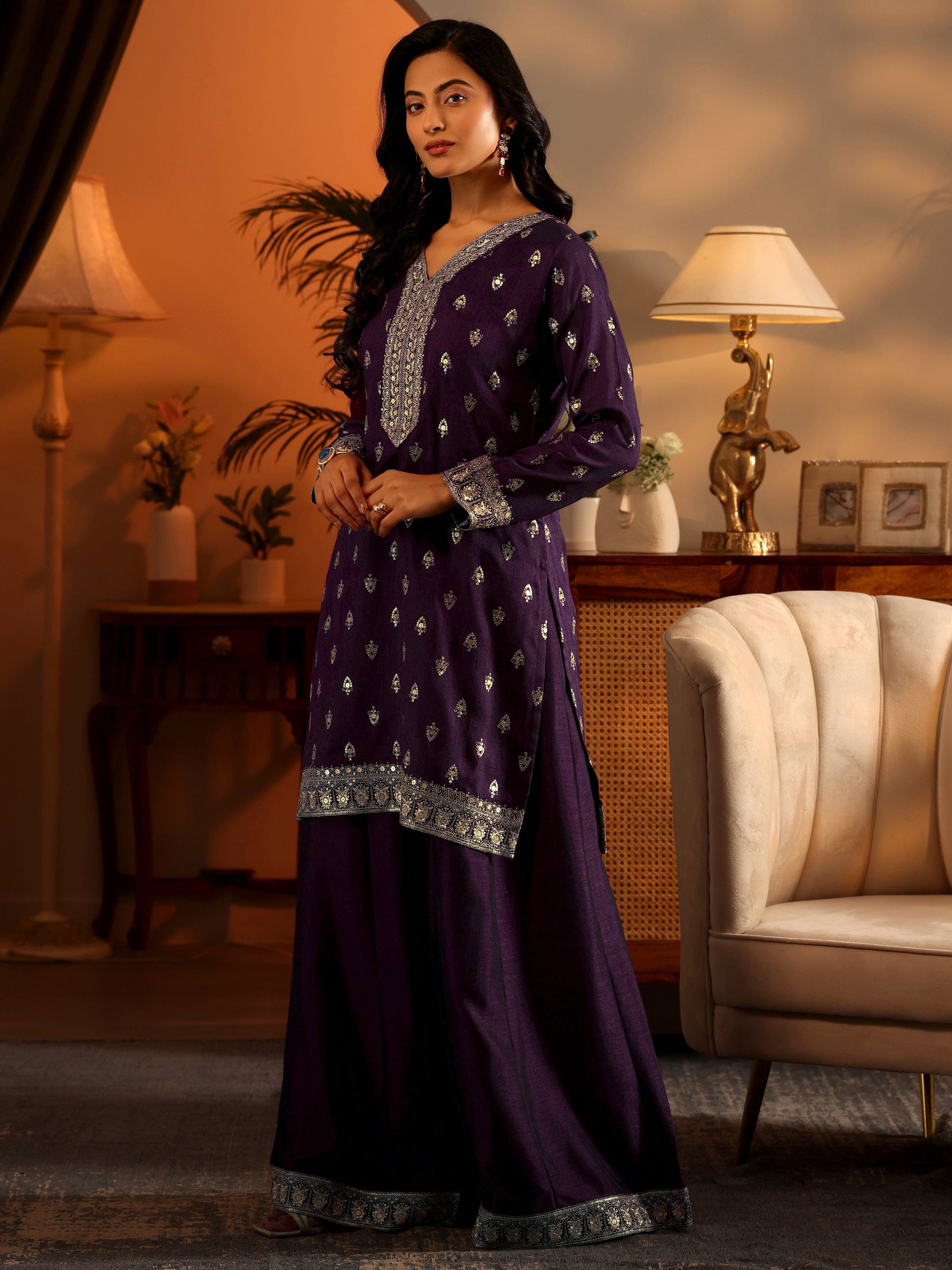 Our 3-piece purple silk blend kurta set features a straight-fit kurta with a V-neckline, regular sleeves, and statement yoke. Complemented with lining and sharara pants with a partially elasticated waistband, and an embroidered dupatta. Adorned with embroidered embellishments, this style is perfect for festive wear.