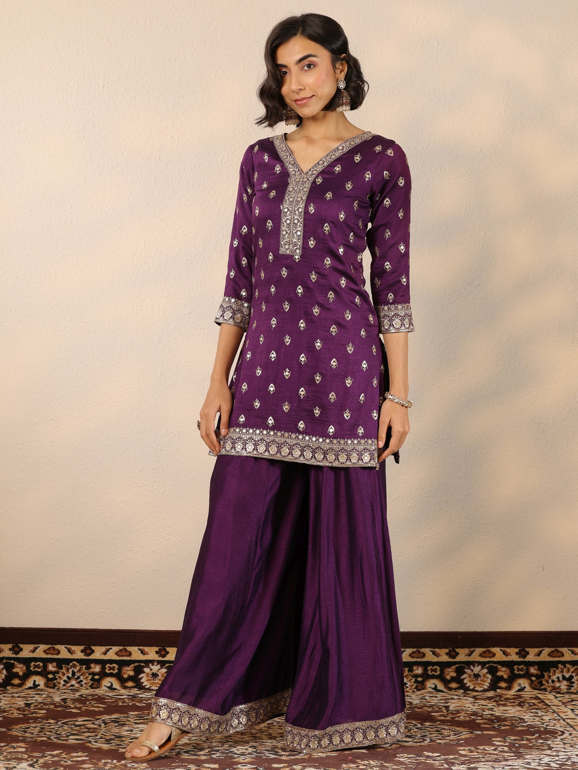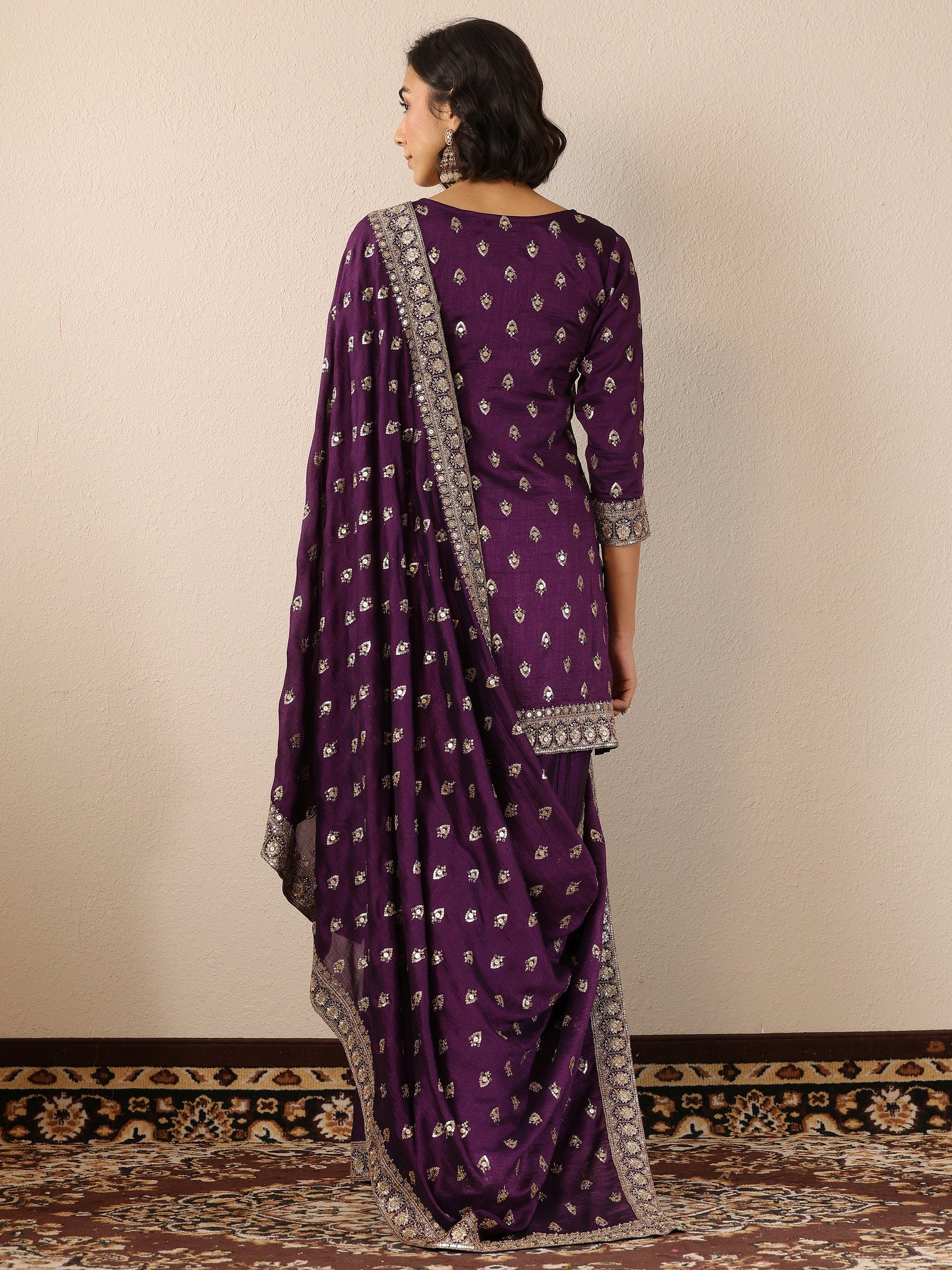 Libas Art Purple Embroidered Silk Blend Straight Suit Set With Dupatta