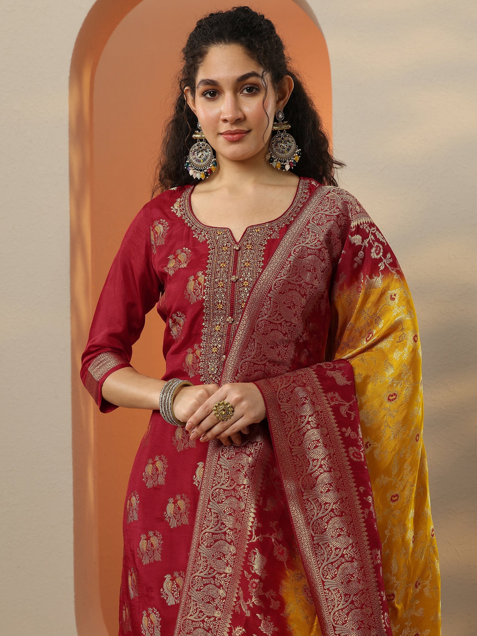 Libas Art Red Woven Design Silk Blend Straight Suit Set With Dupatta