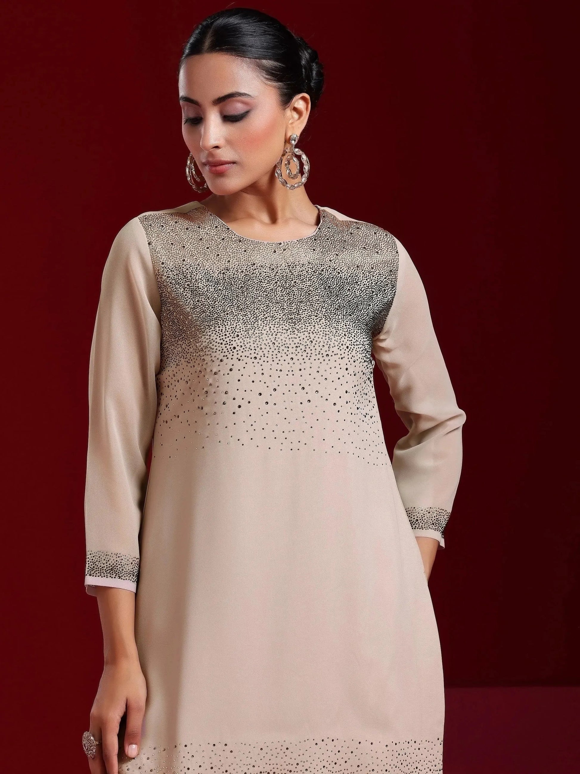 Our 3-piece taupe embellished georgette suit set features a straight-fit round neck kurta with three-quarter sleeves. Complemented with trousers with a partially elasticated waistband, and a dupatta. Elevated with rhinestones, this style is perfect for festive celebrations.