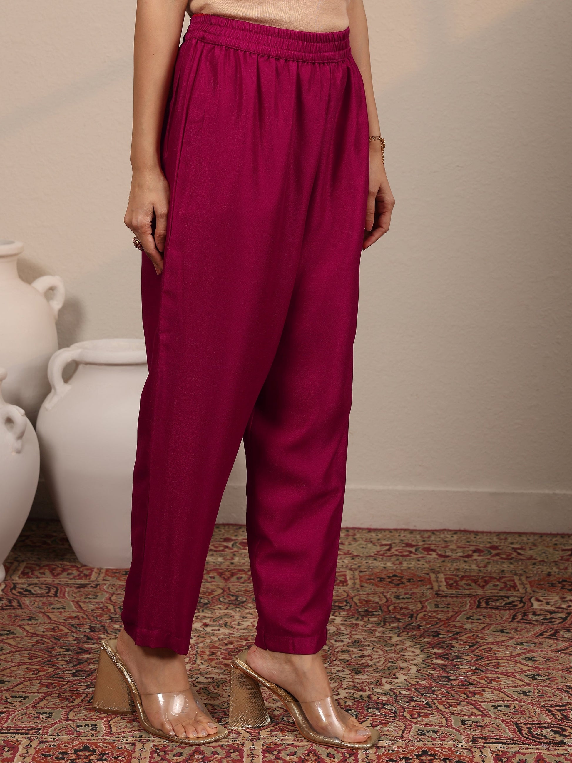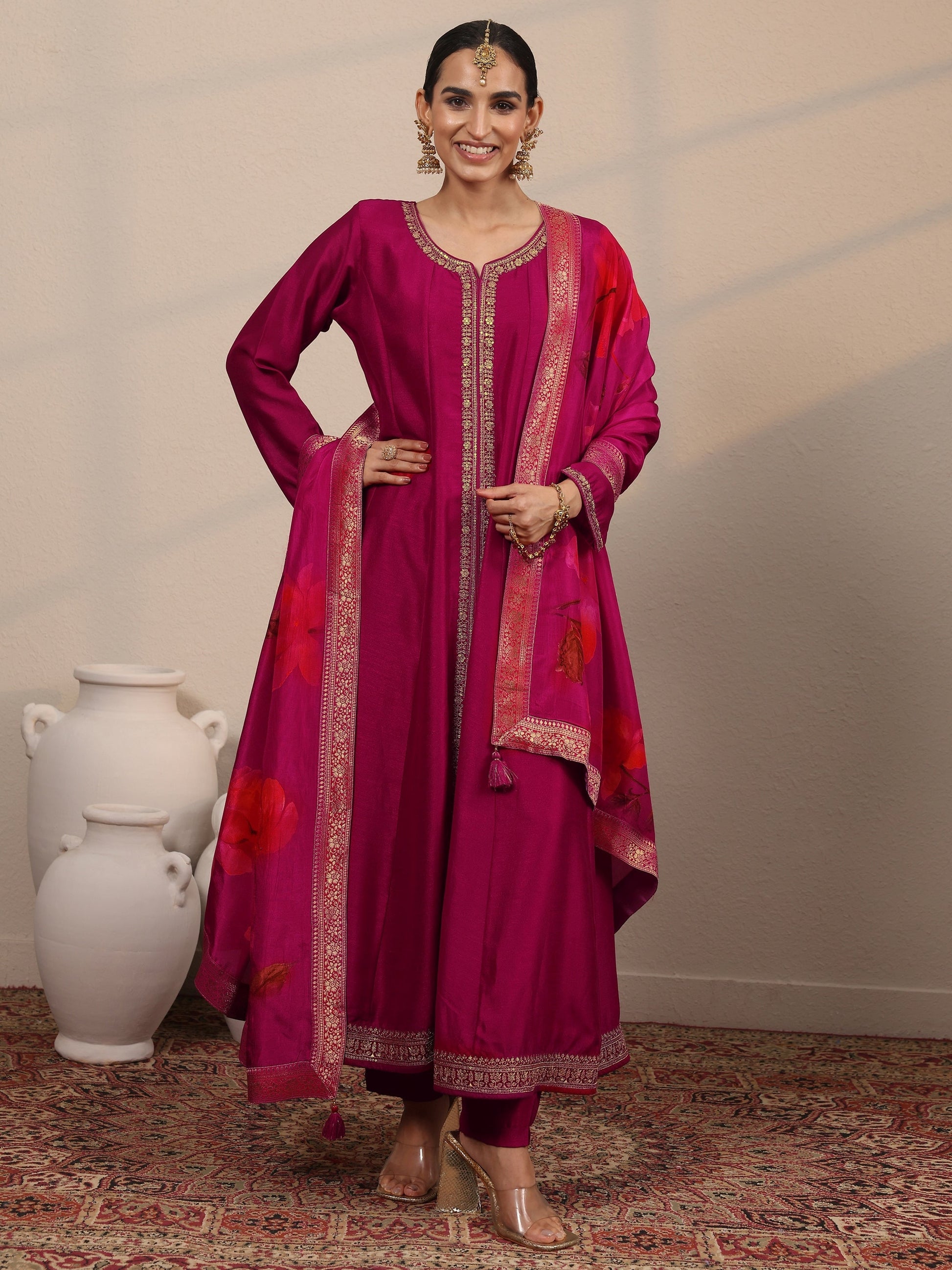 Magenta Embroidered Silk Blend A-Line Suit Set With Dupatta
