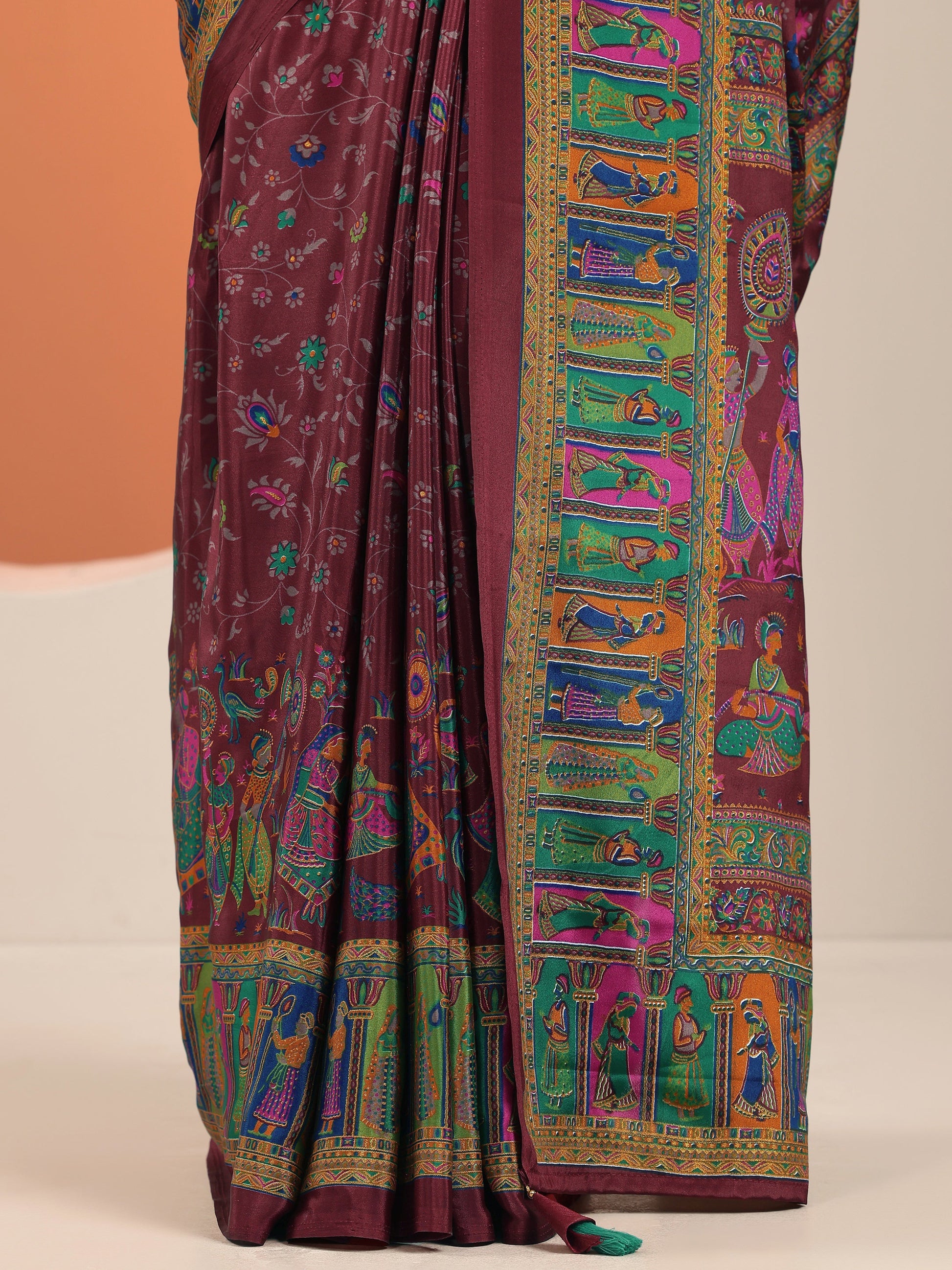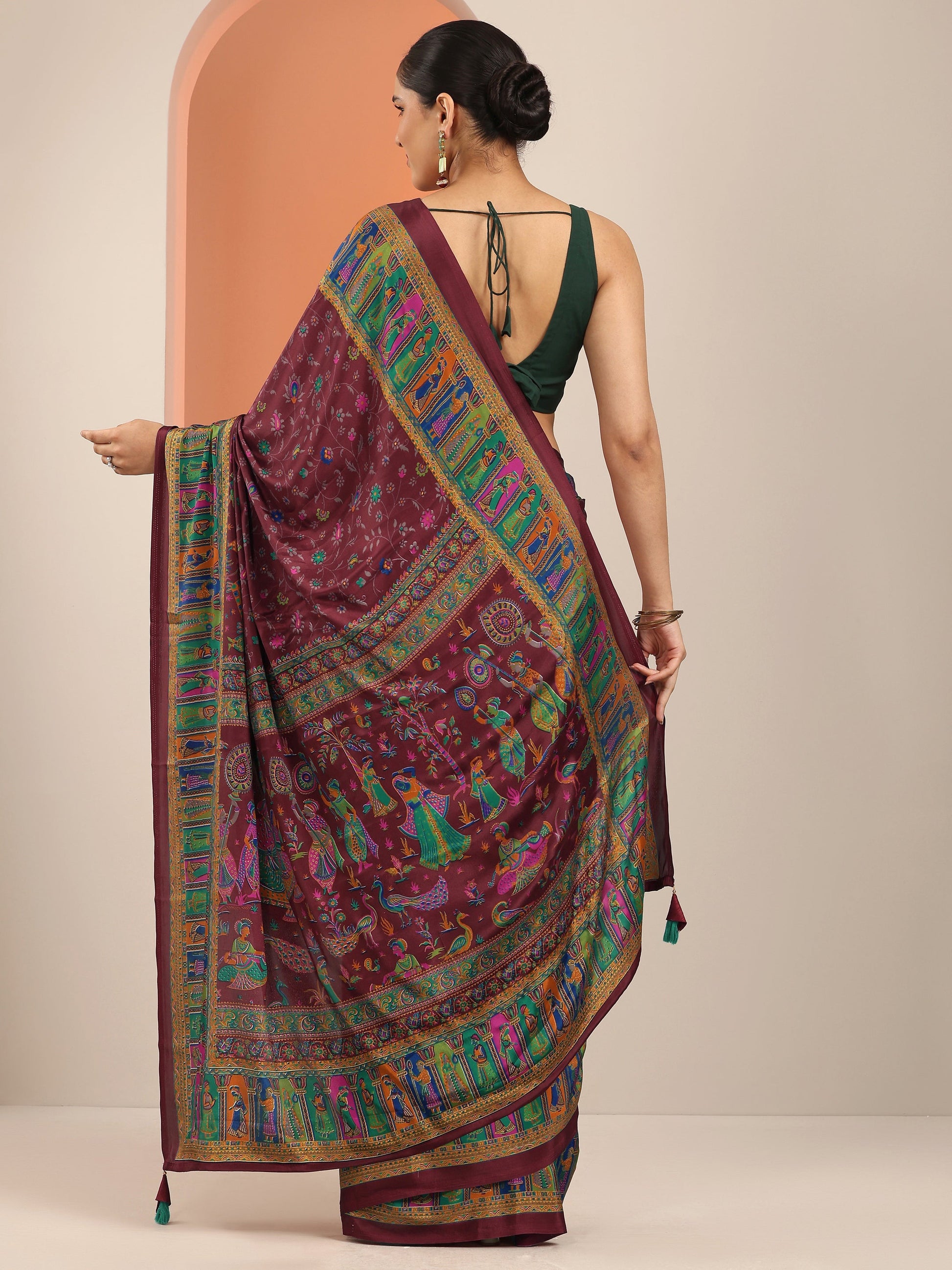 Our Maroon Printed Crepe Saree Features Captivating Tribal Printed Print. Complemented With A Unstitched Blouse Piece. This Charming Saree Is Perfect For Festive Wear