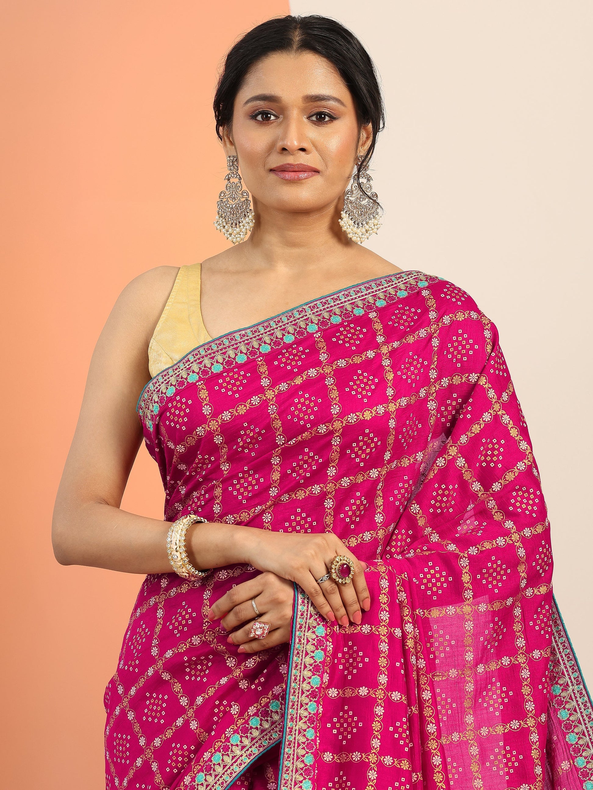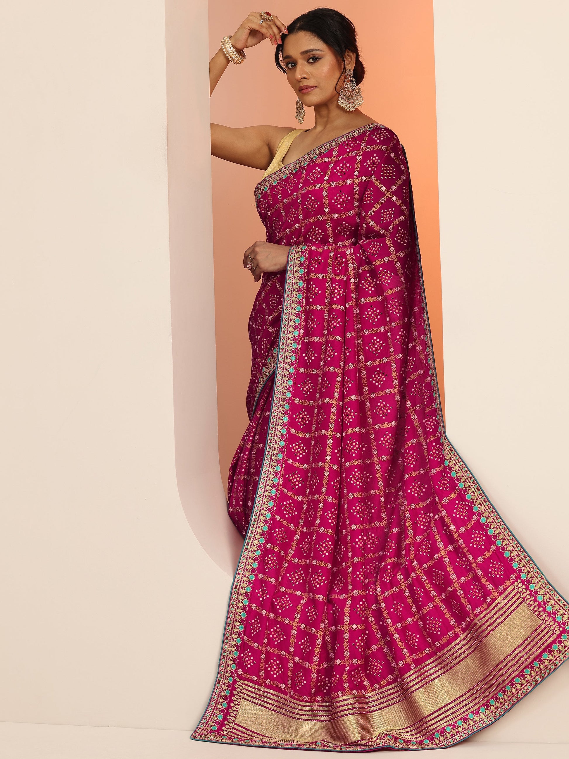 Our Pink Printed Silk Blend Saree Features Captivating Bandhani Printed Design Complemented With Unstitched Blouse Piece. This Charming Saree Is Perfect For Festive Wear