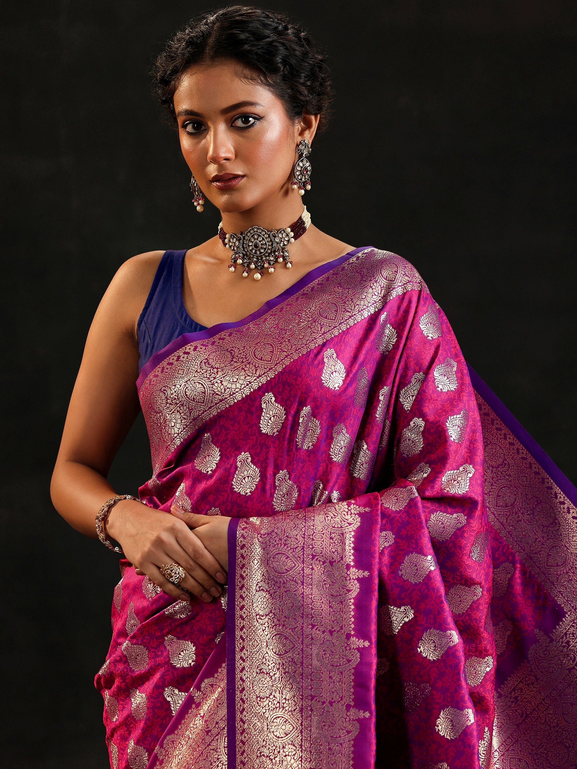 Our Magenta Woven Design Silk Blend Saree. Complemented With A Unstitched Blouse Piece. This Charming Saree Is Perfect For Festive Wear