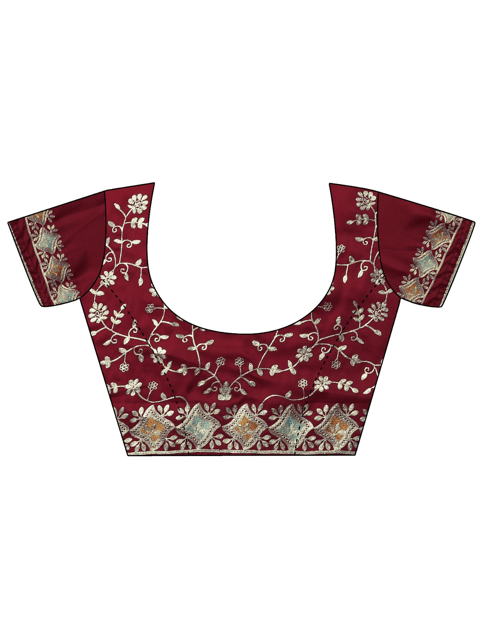 Our maroon satin saree features captivating floral embroidery. Complemented with a stitched blouse. This charming saree is perfect for festive occasions.
