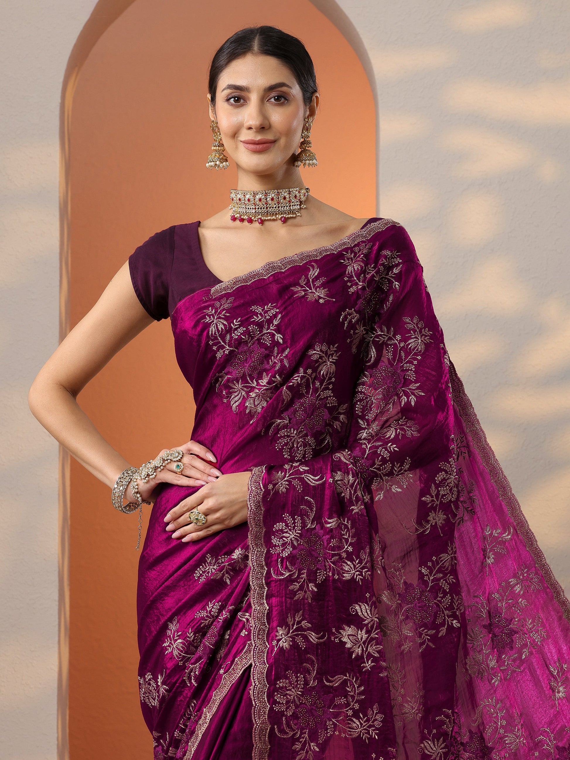 Our maroon embroidered organza saree features captivating floral print. Complemented with a stitched blouse. This charming saree is perfect for festive occasions.