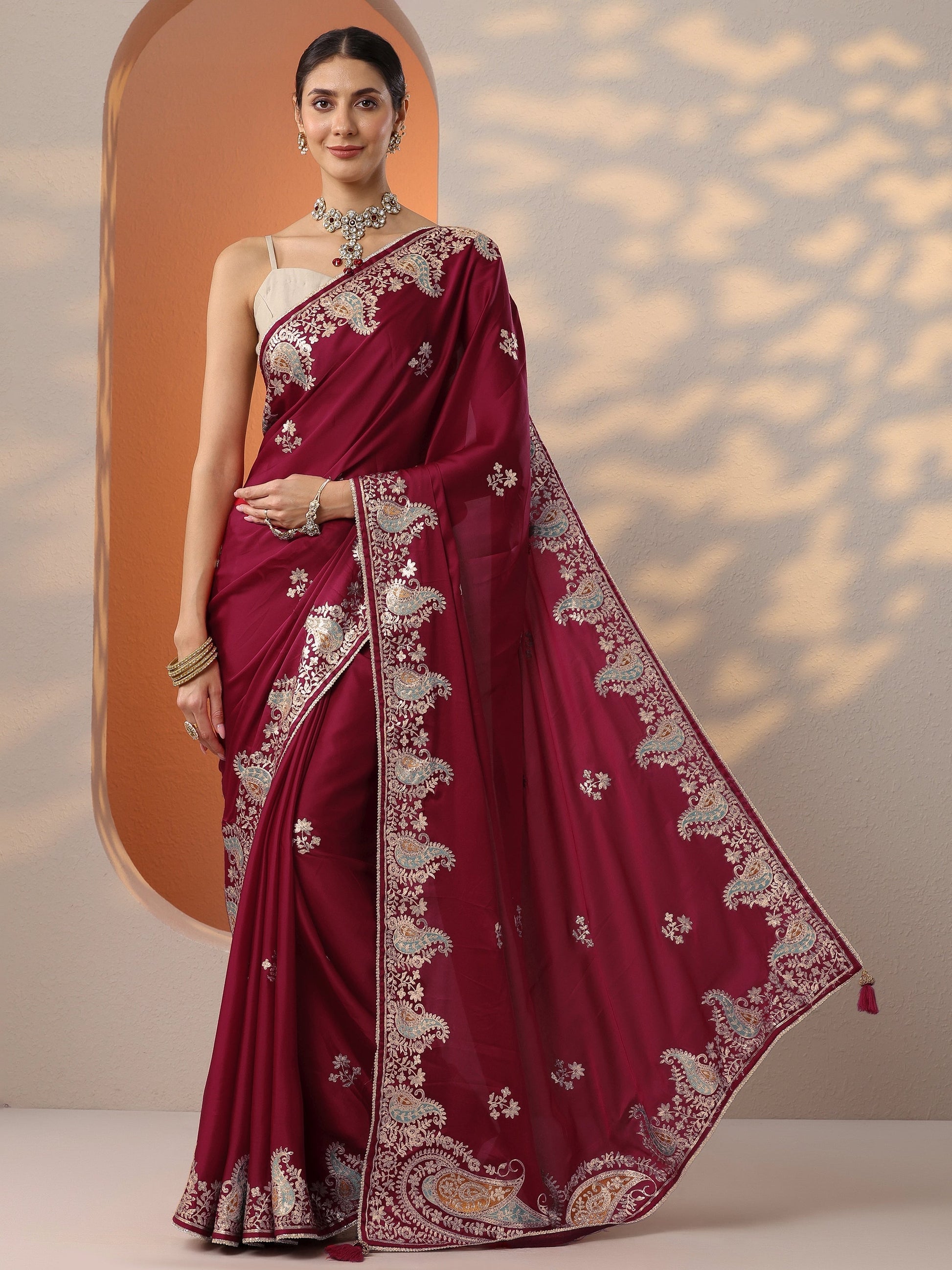 Maroon Embroidered Satin Saree With Unstitched Blouse Piece
