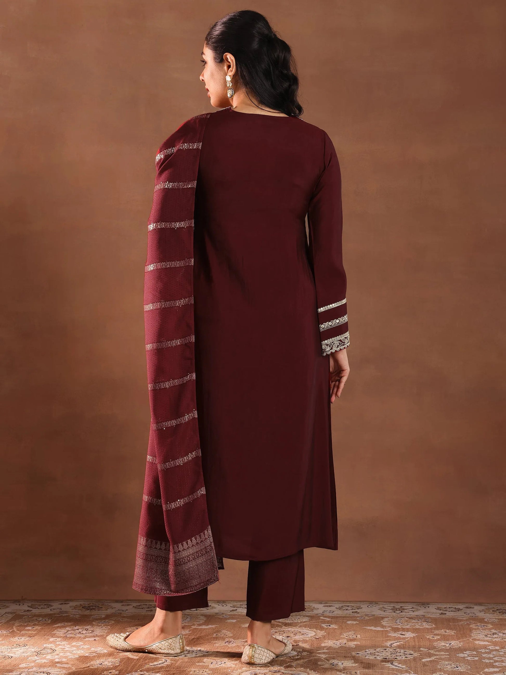 Maroon Embroidered Silk Blend A-Line Suit Set With Dupatta