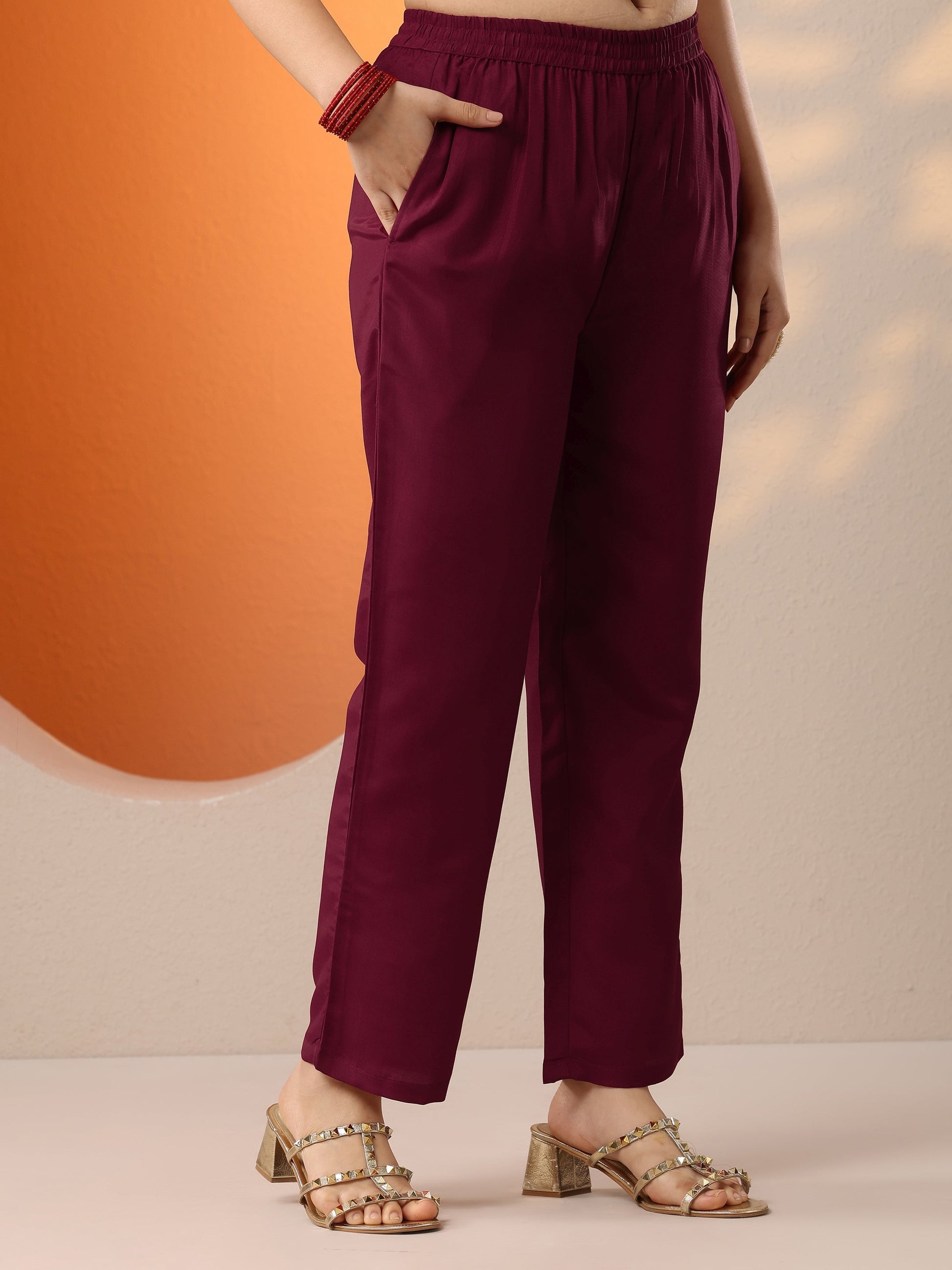 Our 3-piece maroon silk blend Anarkali kurta set features a sweetheart neckline, regular sleeves, and statement yoke. Complemented with lining and straight pants with a partially elasticated waistband and 2 pockets, and an embroidered dupatta. Adorned with embroidered embellishments, this style is perfect for dark festive occasions.