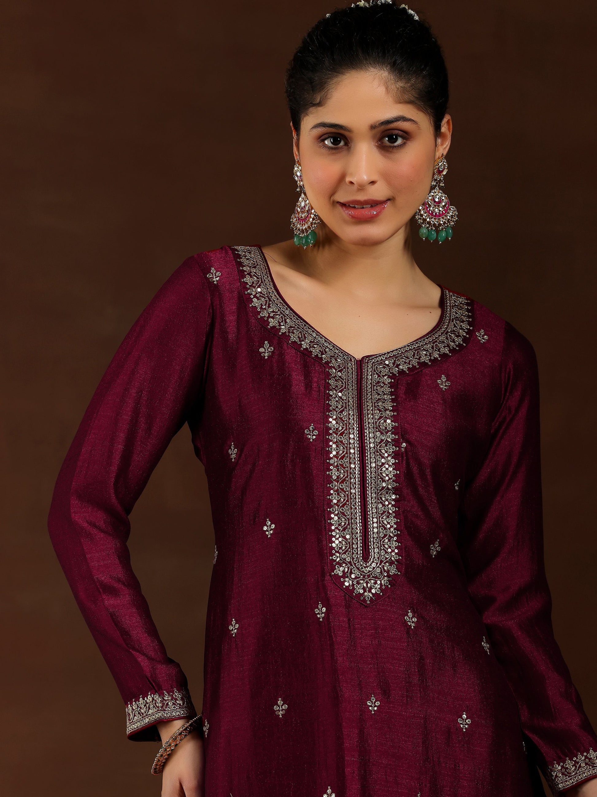 Maroon Embroidered Silk Blend Straight Suit With Dupatta