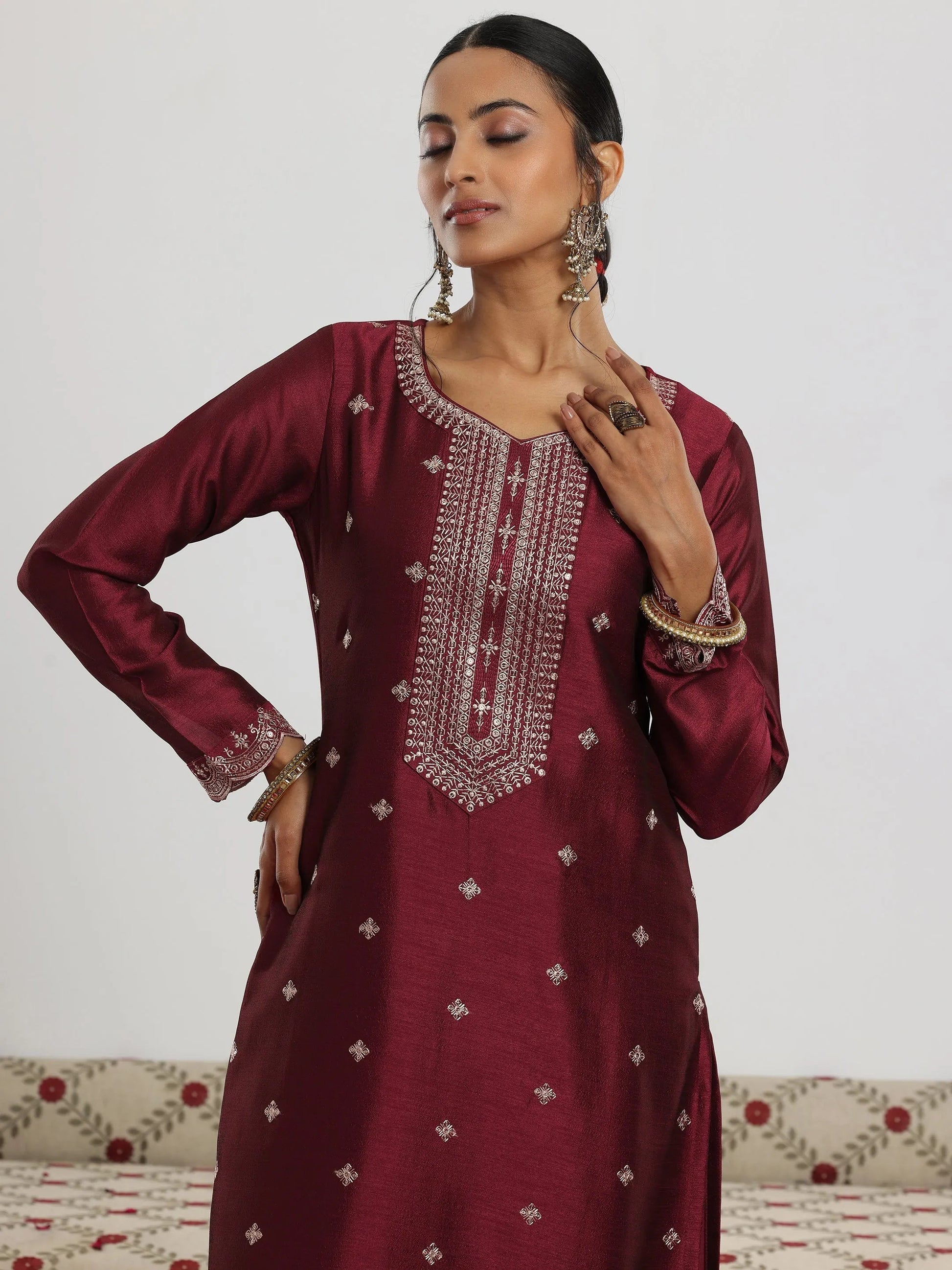 Maroon Embroidered Silk Blend Straight Suit With Dupatta