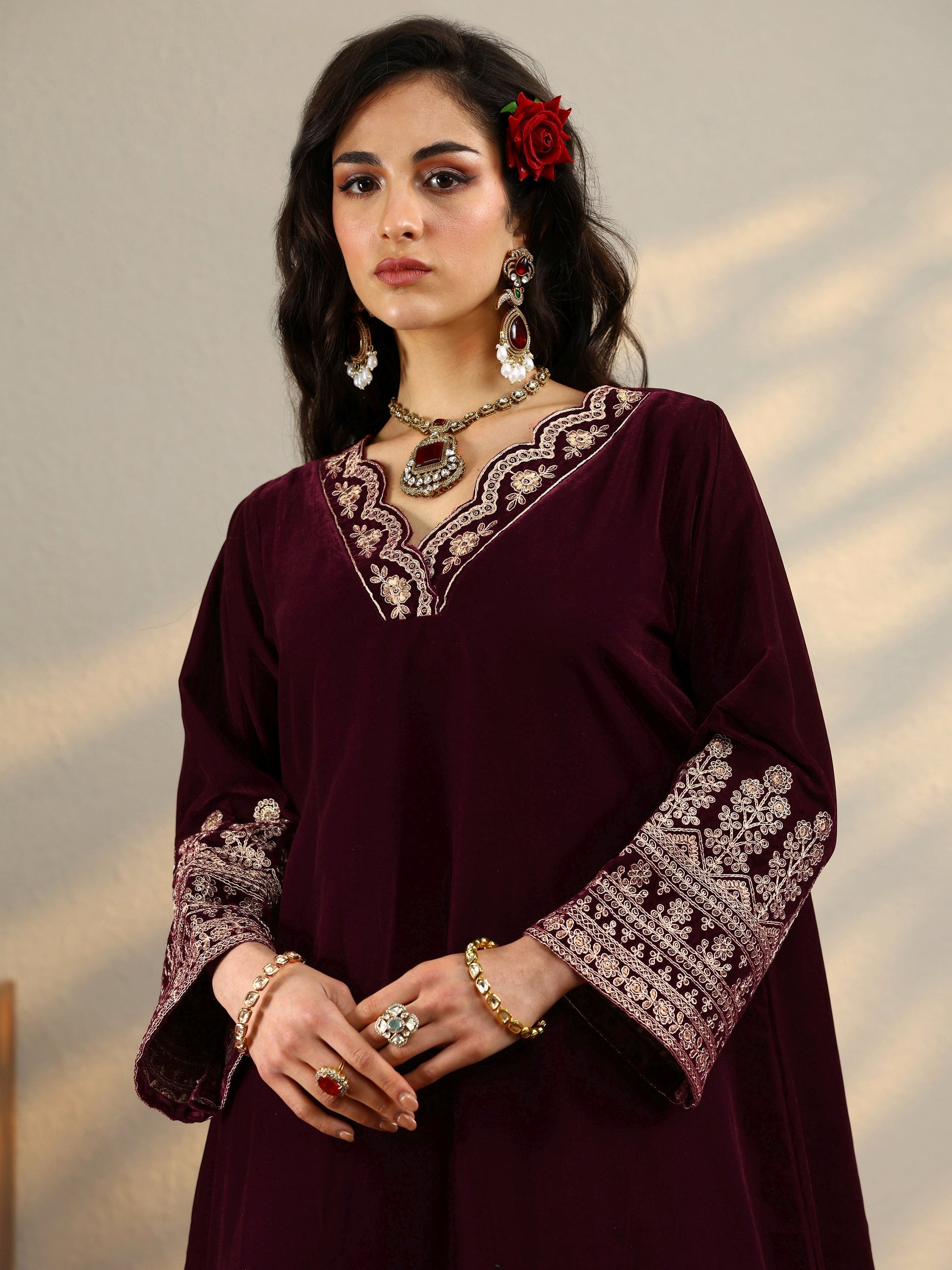 Our 2-piece maroon velvet straight-fit kurta set features a V-neckline, regular sleeves, and statement yoke. Complemented with straight pants with a partially elasticated waistband and 2 pockets. Adorned with Embroidered, this style is perfect for Dark Festive.