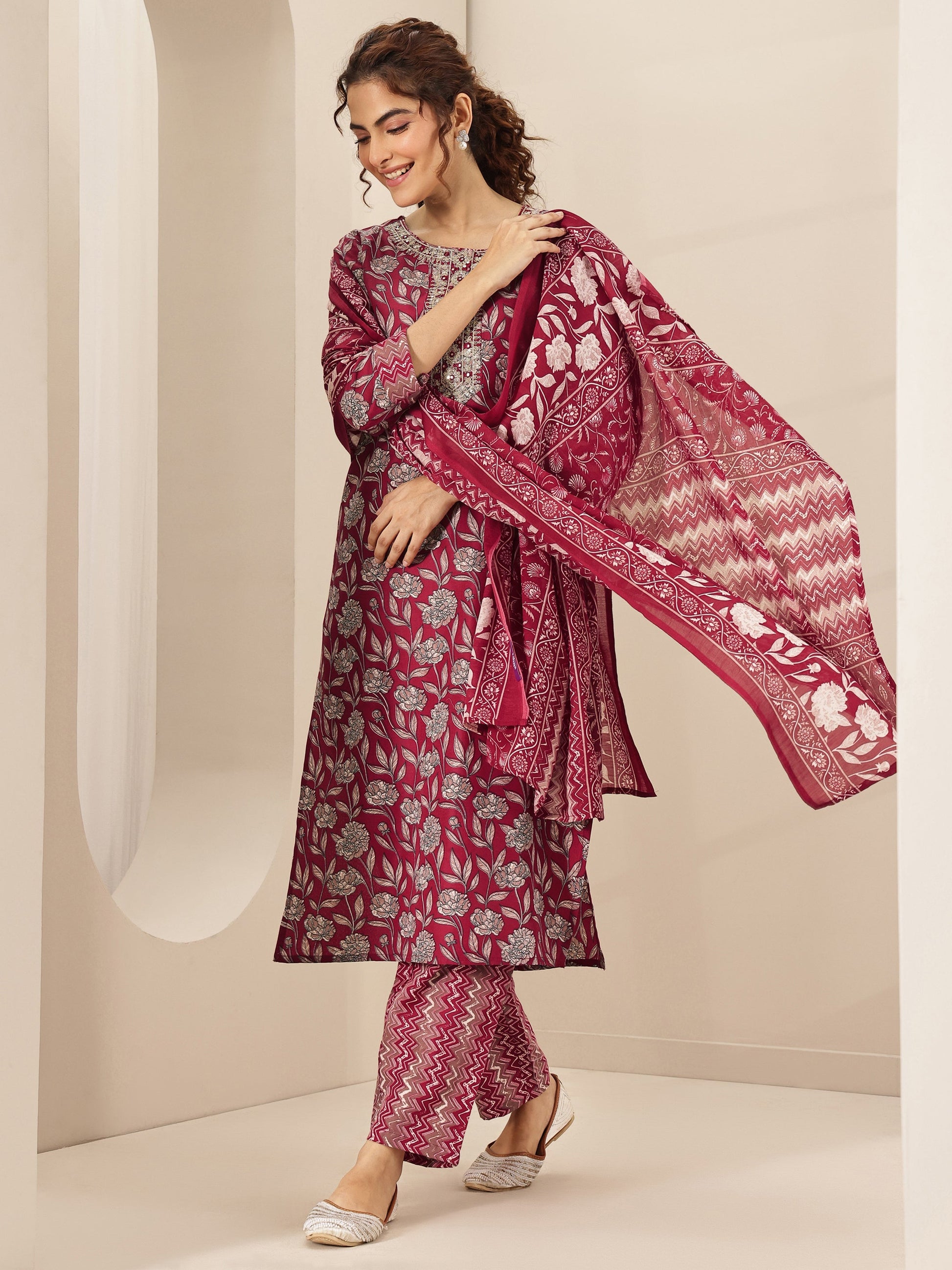 Maroon Printed Cotton Blend Straight Suit Sets With Dupatta