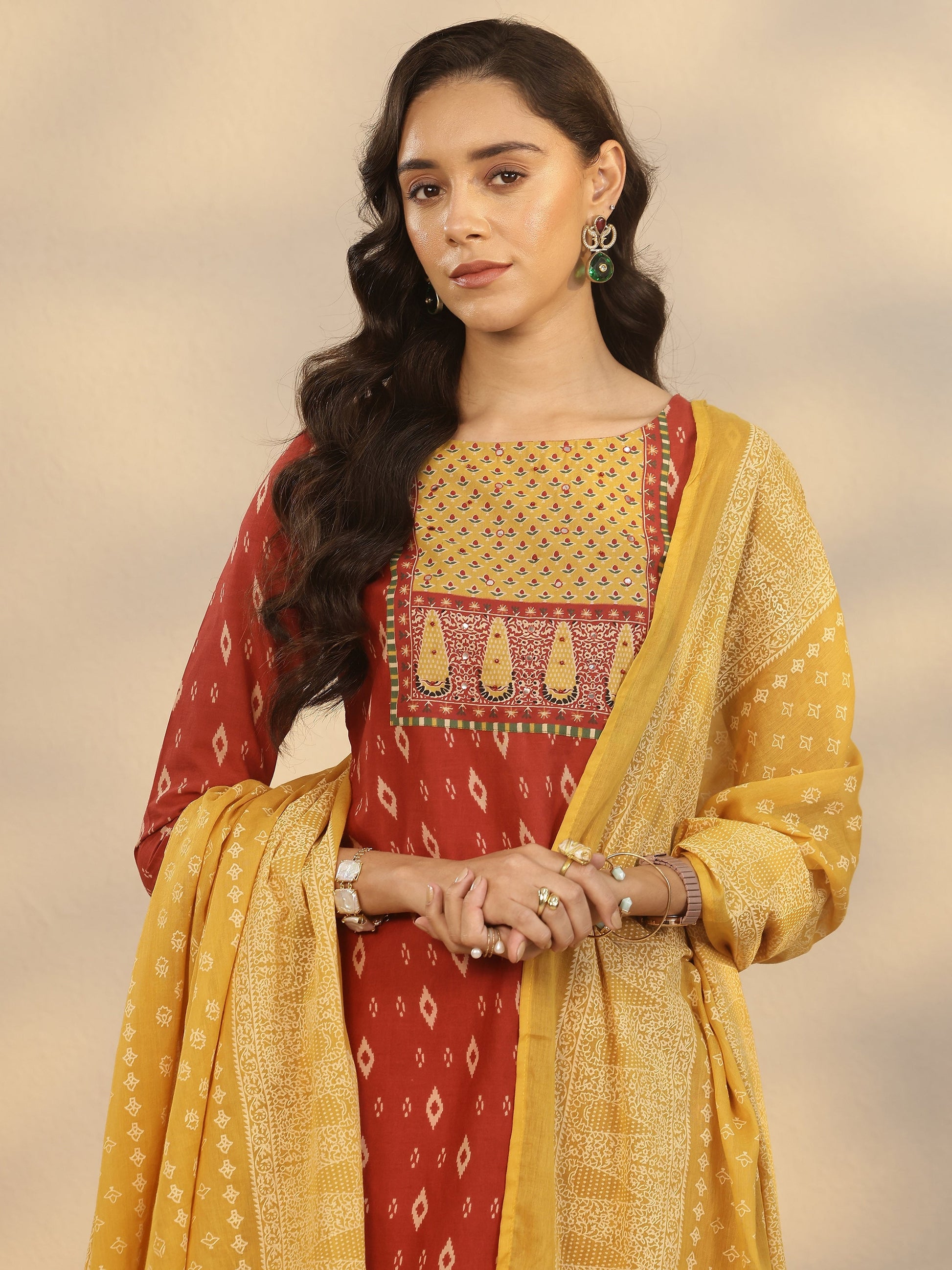 Maroon Printed Cotton Straight Suit Set With Dupatta