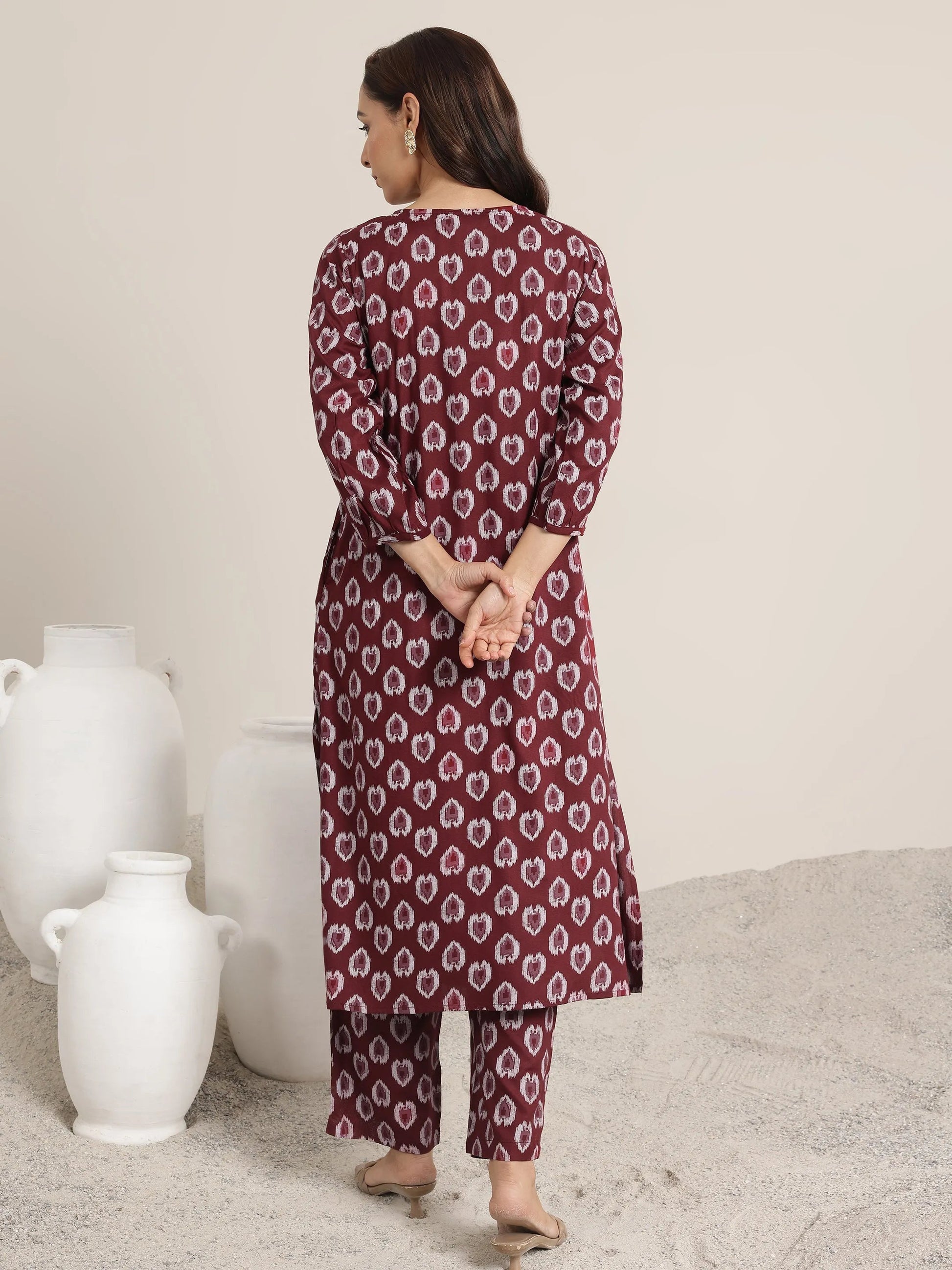 Our 2-piece maroon printed rayon straight kurta set features a kurta with a V-neckline and three-quarter sleeves. Complemented with trousers with a partially elasticated waistband and roomy pockets. Highlighted with Ikat-inspired prints, this style is perfect for casual outings.