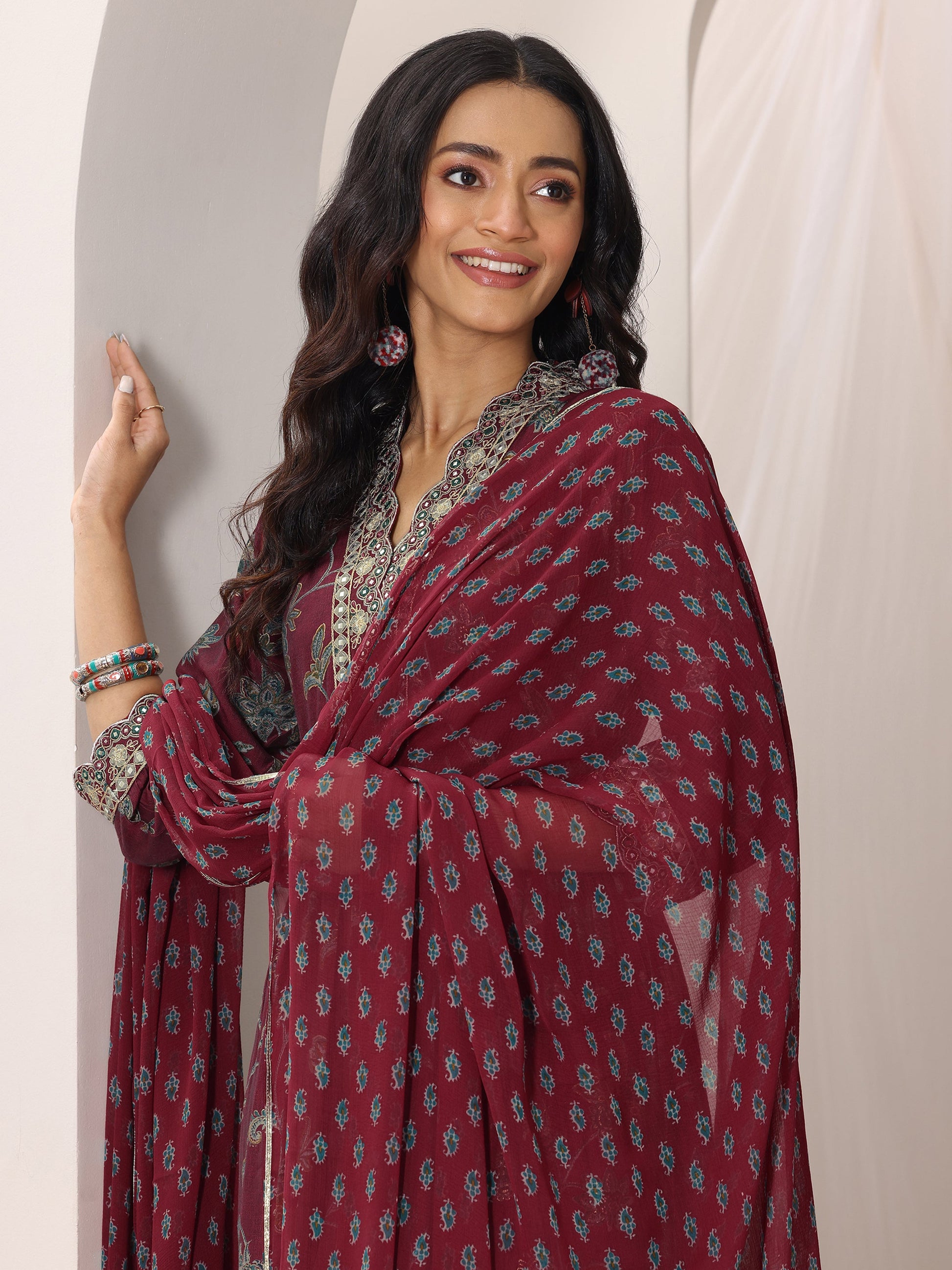 Maroon Printed Silk Blend A-Line Suit Set With Dupatta