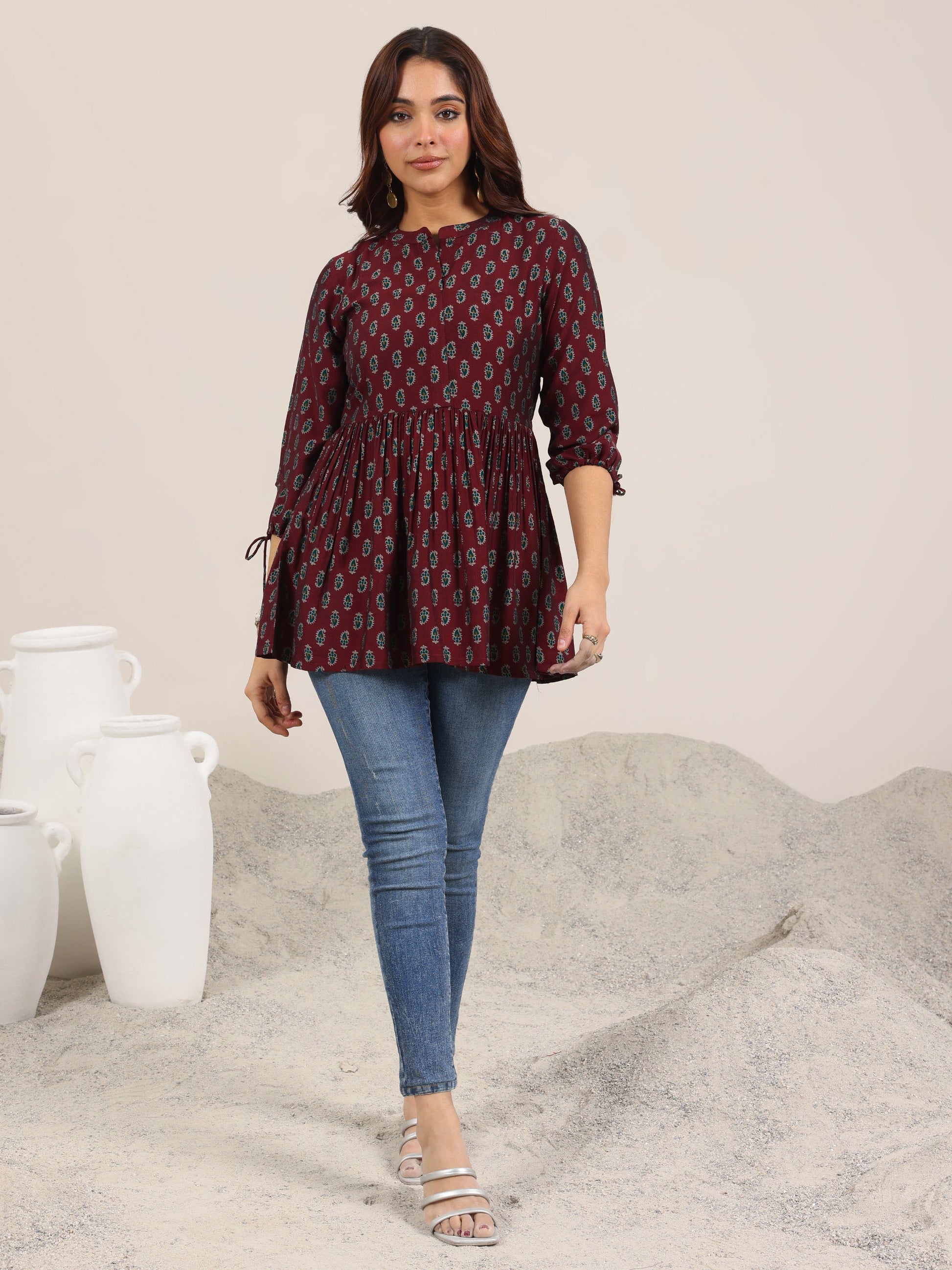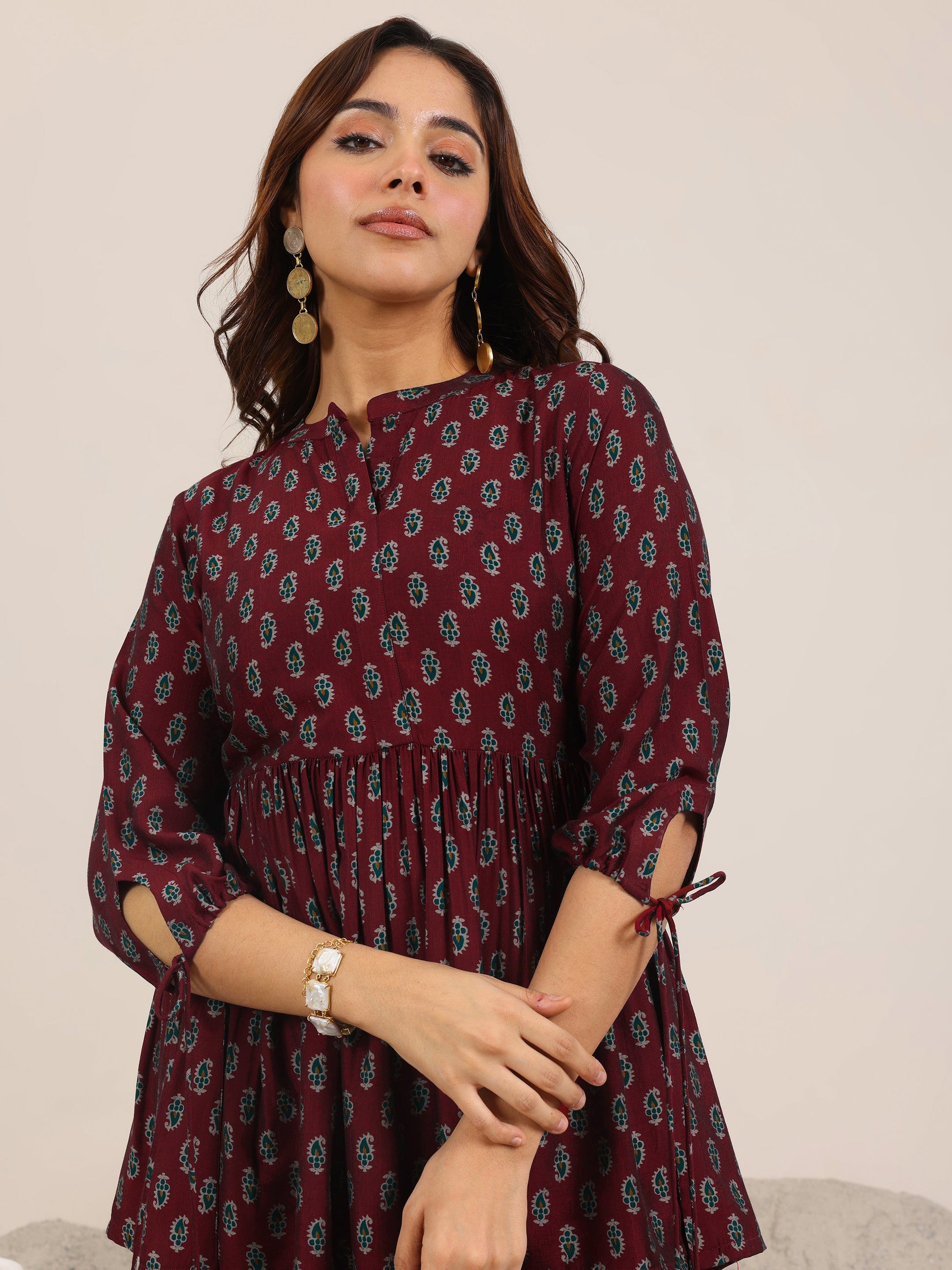Maroon Printed Silk Blend Anarkali Short Kurti
