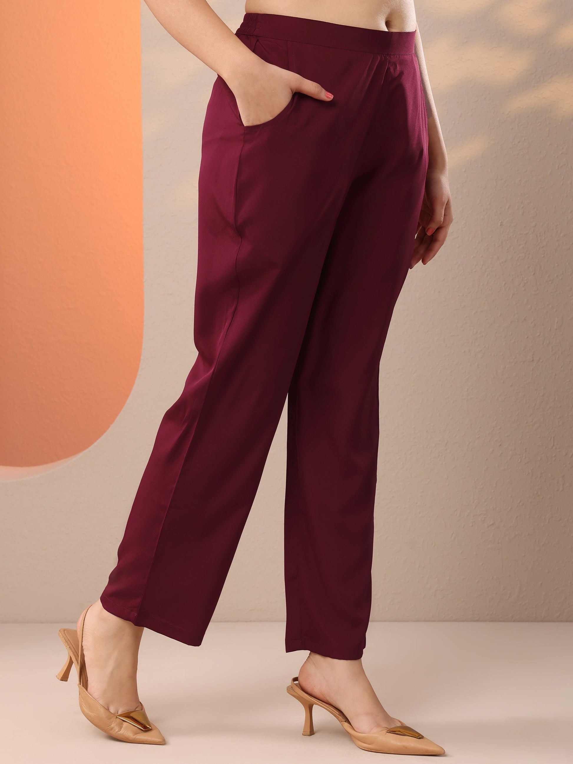 Our 3-piece maroon silk blend Anarkali kurta set features a round neckline, regular sleeves, and a statement yoke. Complemented with straight pants with a partially elasticated waistband and 2 pockets, and a dupatta adorned with block printed motifs. Adorned with block printed motifs, this style is perfect for dark festive occasions.