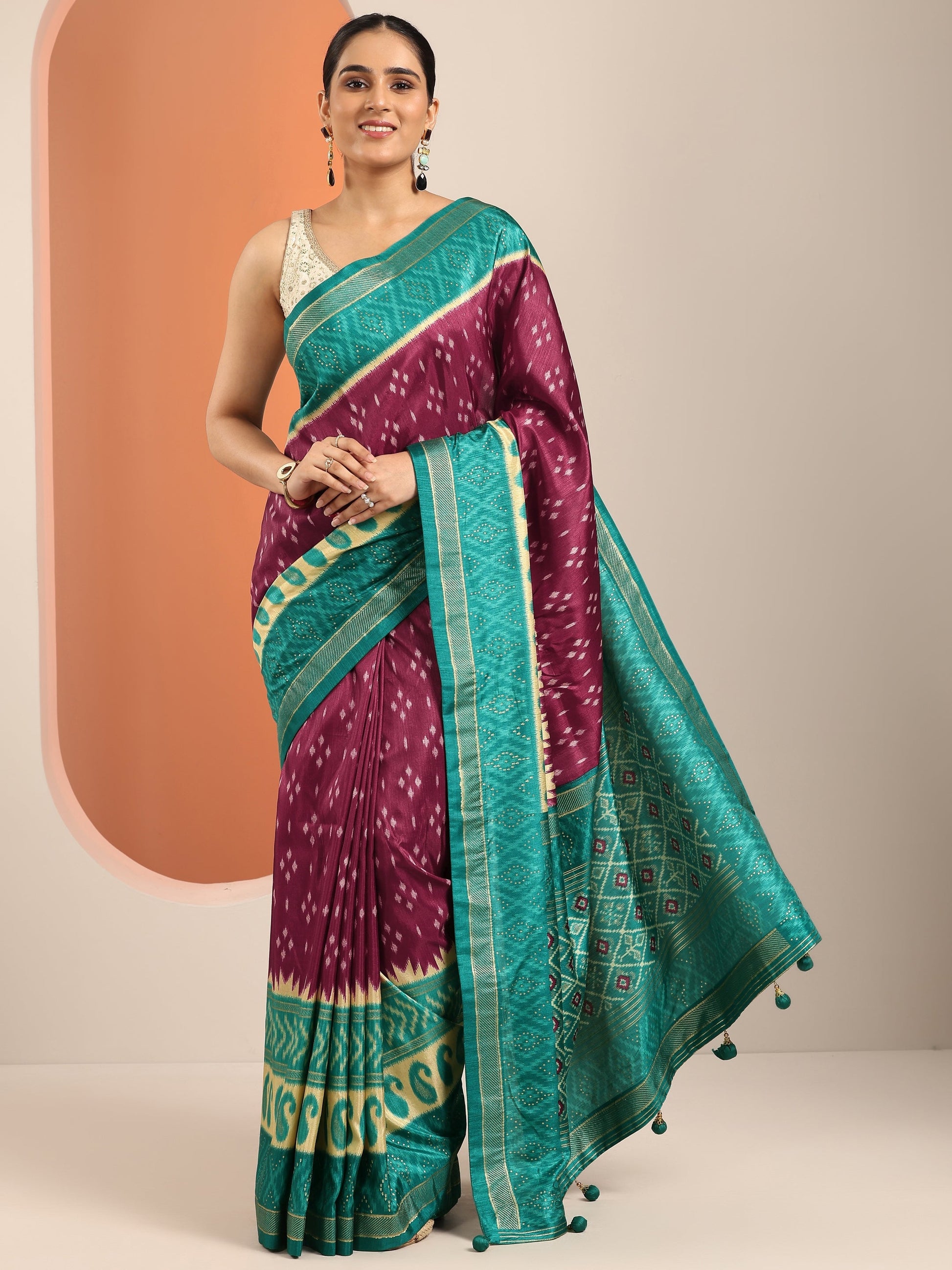Our Maroon Printed Silk Blend Saree Features Captivating Bandhani Print. Complemented With A Unstitched Blouse Piece. This Charming Saree Is Perfect For Festive Wear