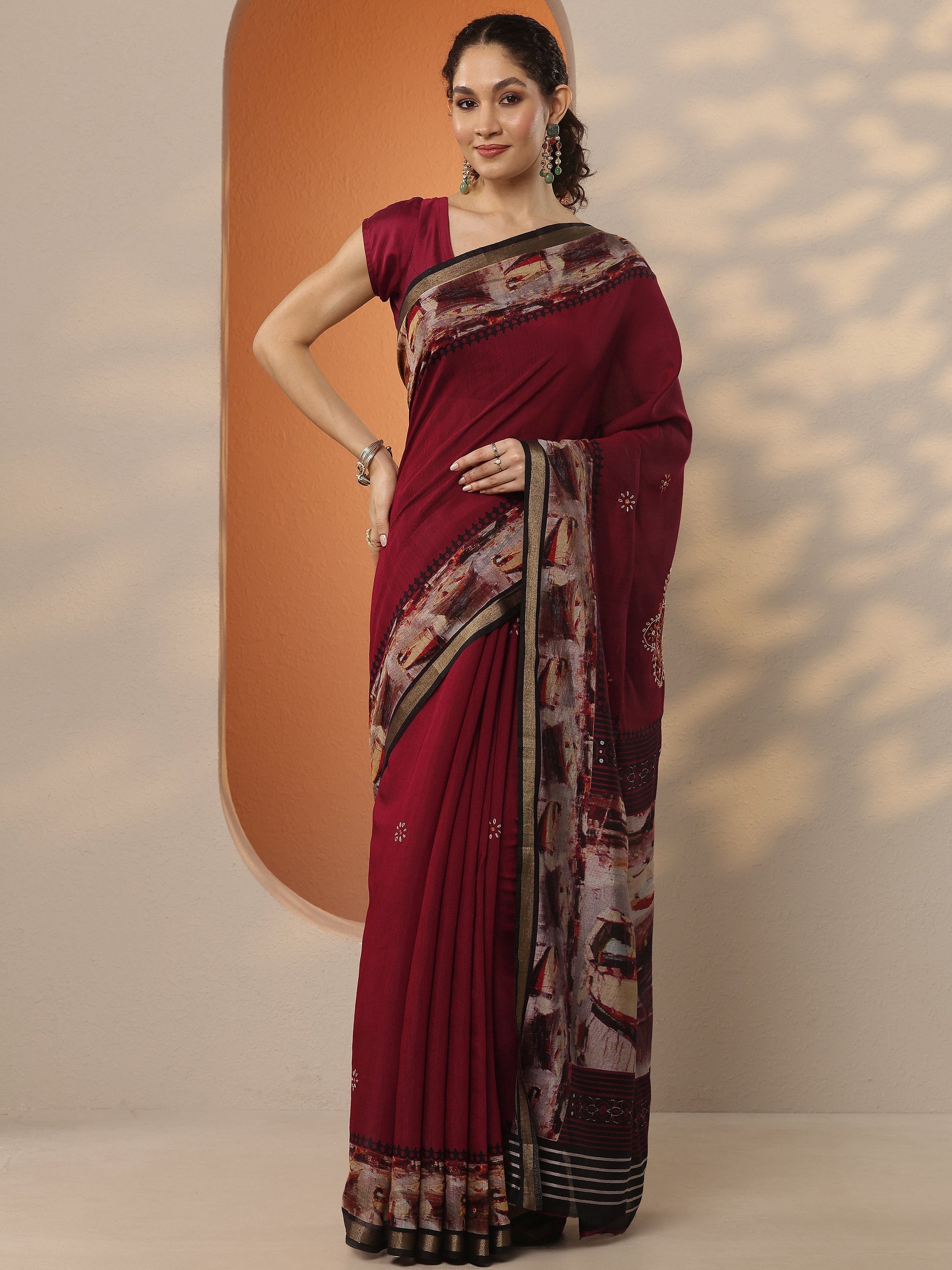 Maroon Printed Silk Blend Saree With Unstitched Blouse Piece