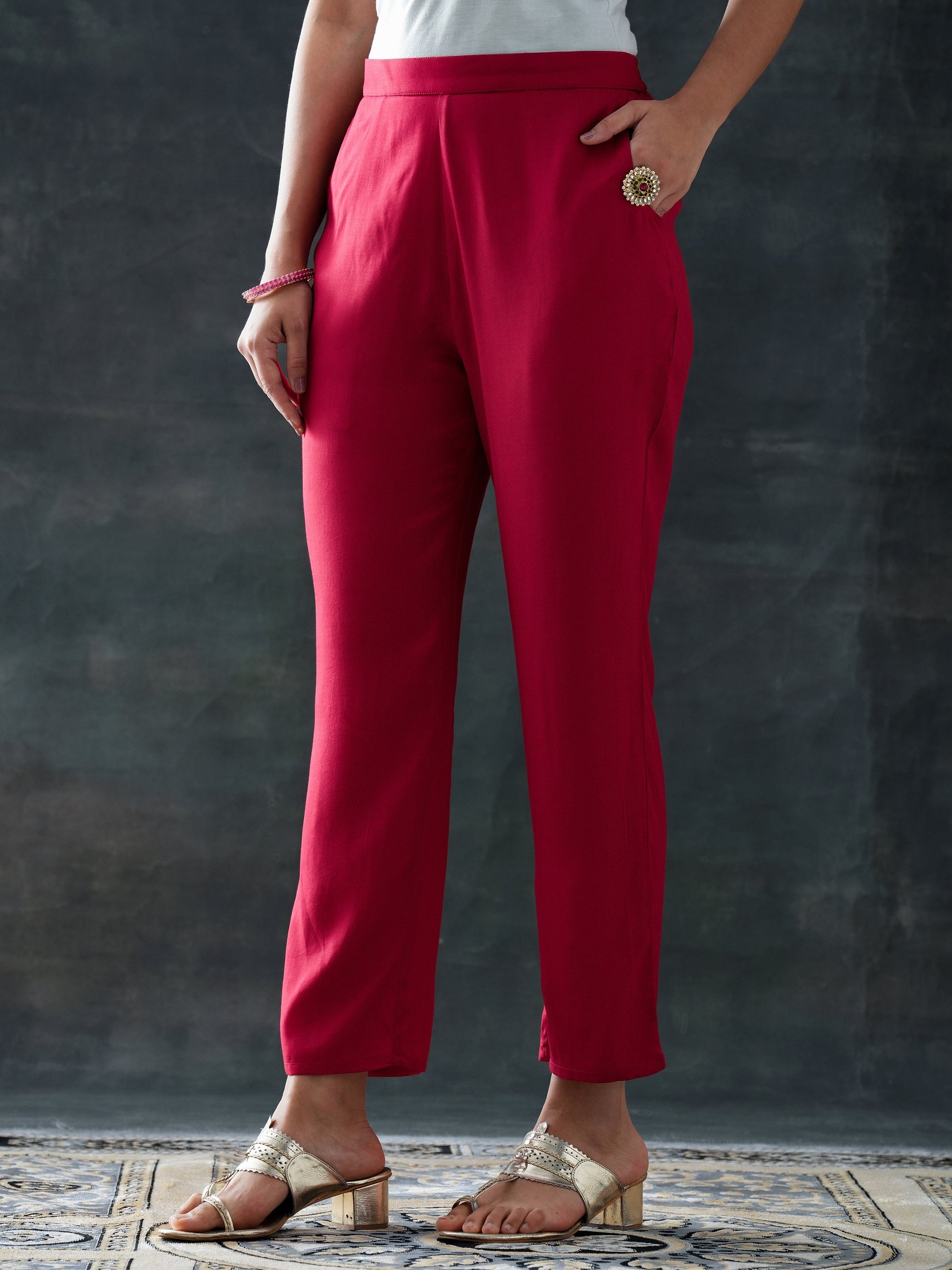Our 3-piece Red Silk blend Straight-fit Kurta Set features a V-Neckline, Regular Sleeves, and statement Yoke. Complemented with Straight Pants with a Partially Elasticated waistband and 2 pockets, and a Printed dupatta. Adorned with Bandhani inspired print, this style is perfect for Casual wear.