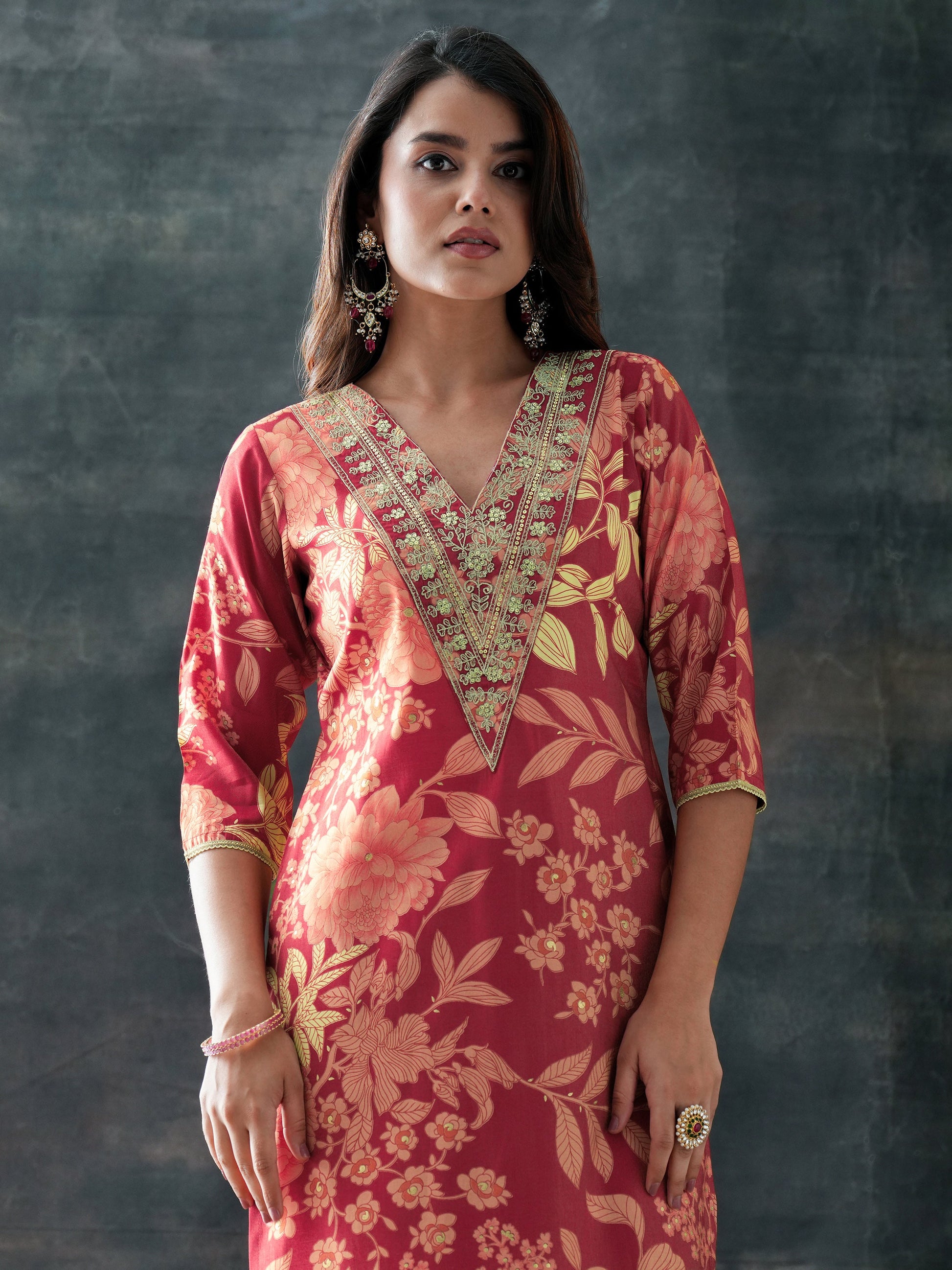 Our 3-piece Red Silk blend Straight-fit Kurta Set features a V-Neckline, Regular Sleeves, and statement Yoke. Complemented with Straight Pants with a Partially Elasticated waistband and 2 pockets, and a Printed dupatta. Adorned with Floral Printed embellishments, this style is perfect for Festive wear.