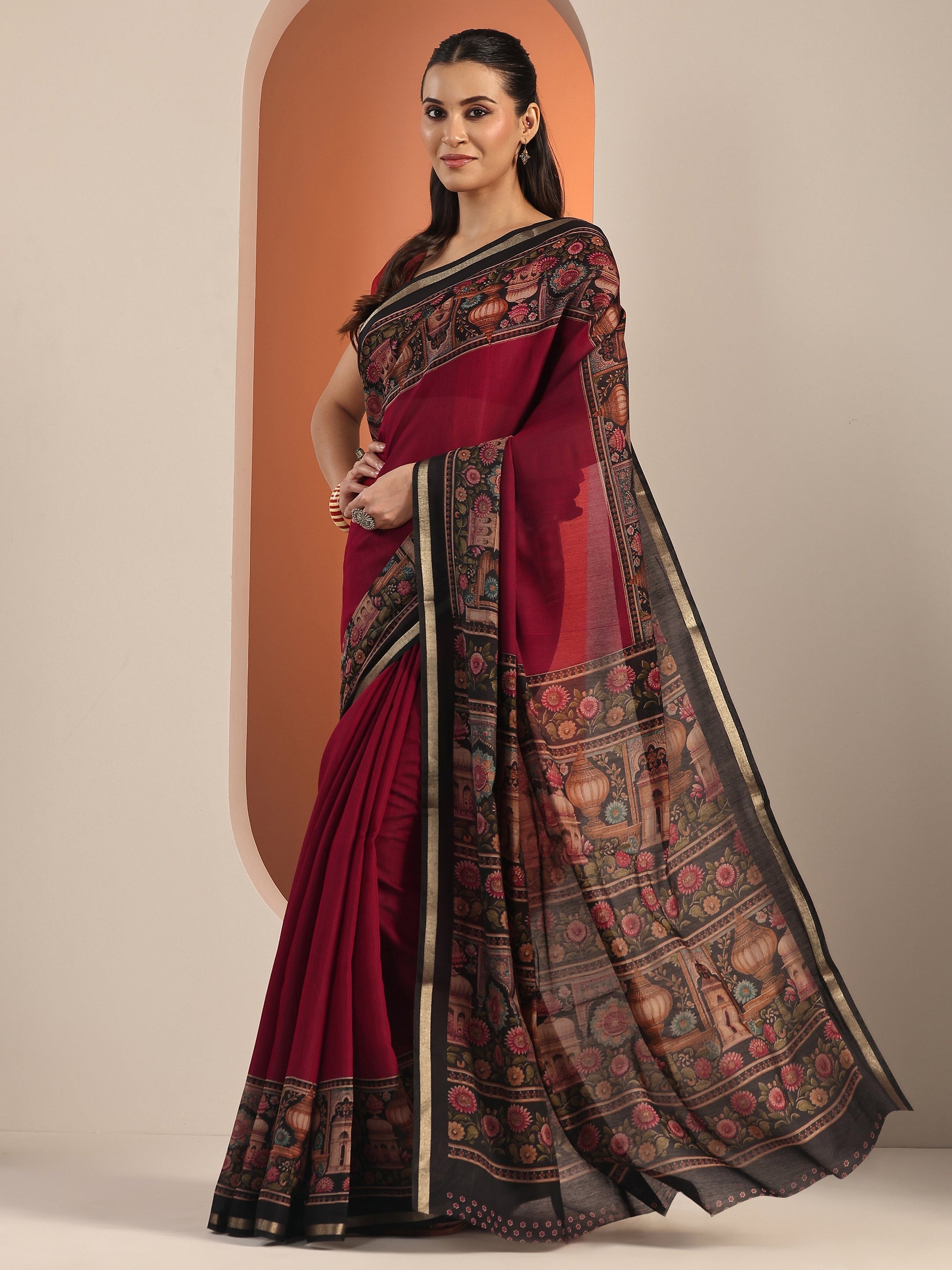 Our Maroon Printed Cotton Blend Saree Features Captivating Solid Print. Complemented With A Unstitched Blouse Piece. This Charming Saree Is Perfect For Festive Wear.