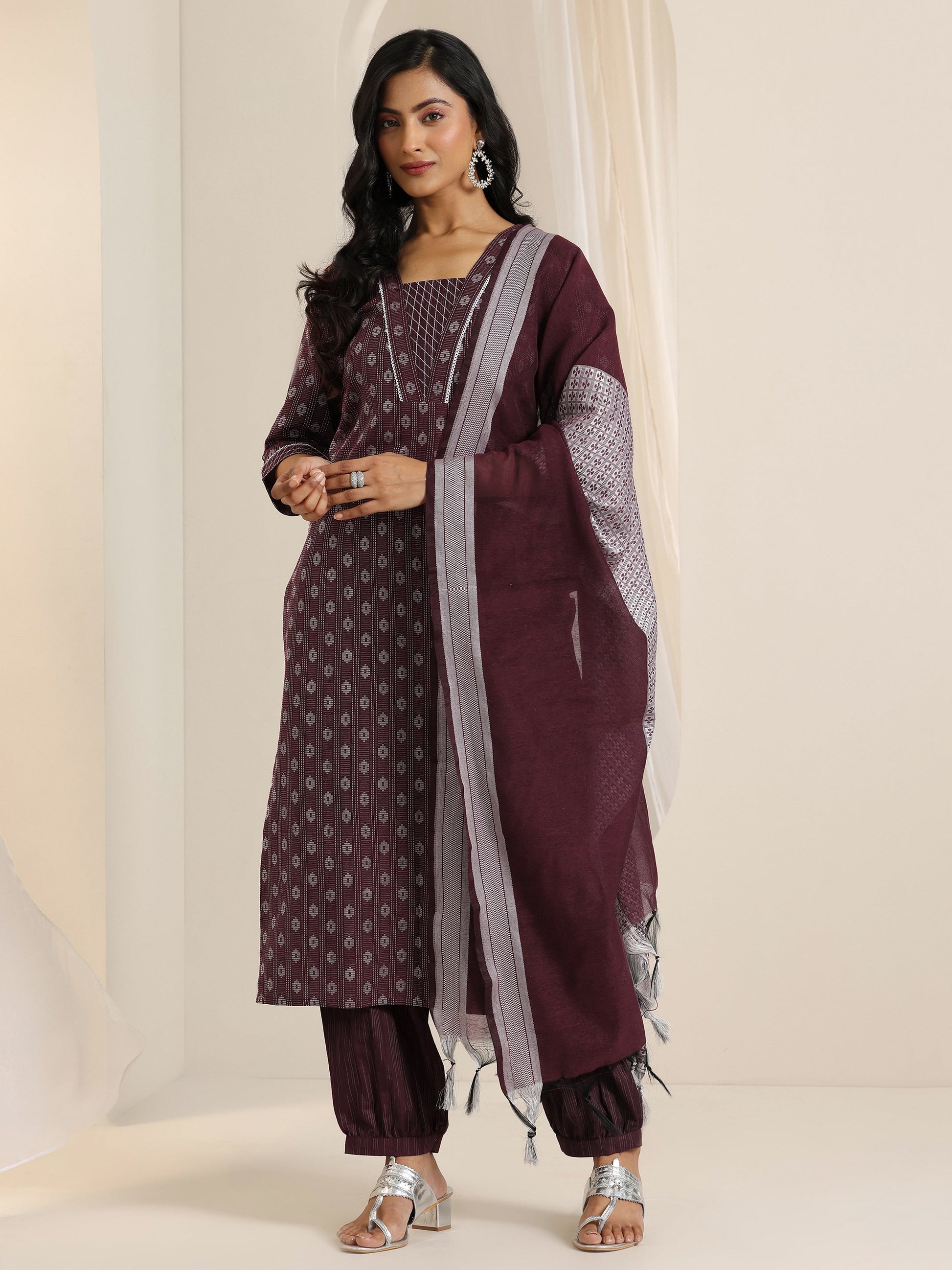 Maroon Woven Design Cotton Blend Straight Suit Set With Dupatta