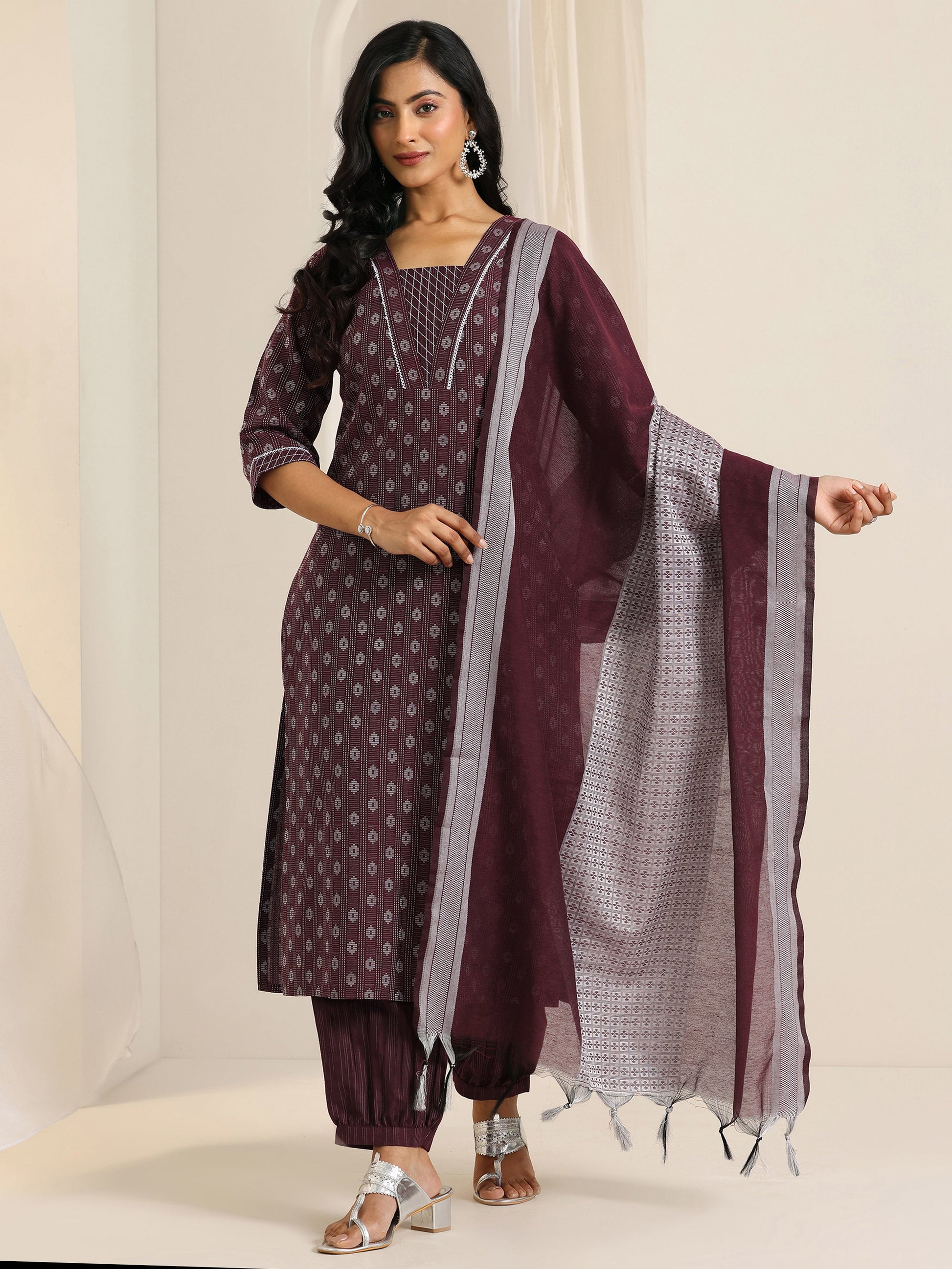 Our 3-piece maroon cotton blend suit set features a straight-fit kurta with a square neckline, regular sleeves, and a statement yoke. Complemented with salwar pants with an elasticated waistband and a printed dupatta. Adorned with self-design, this style is perfect for casual occasions.