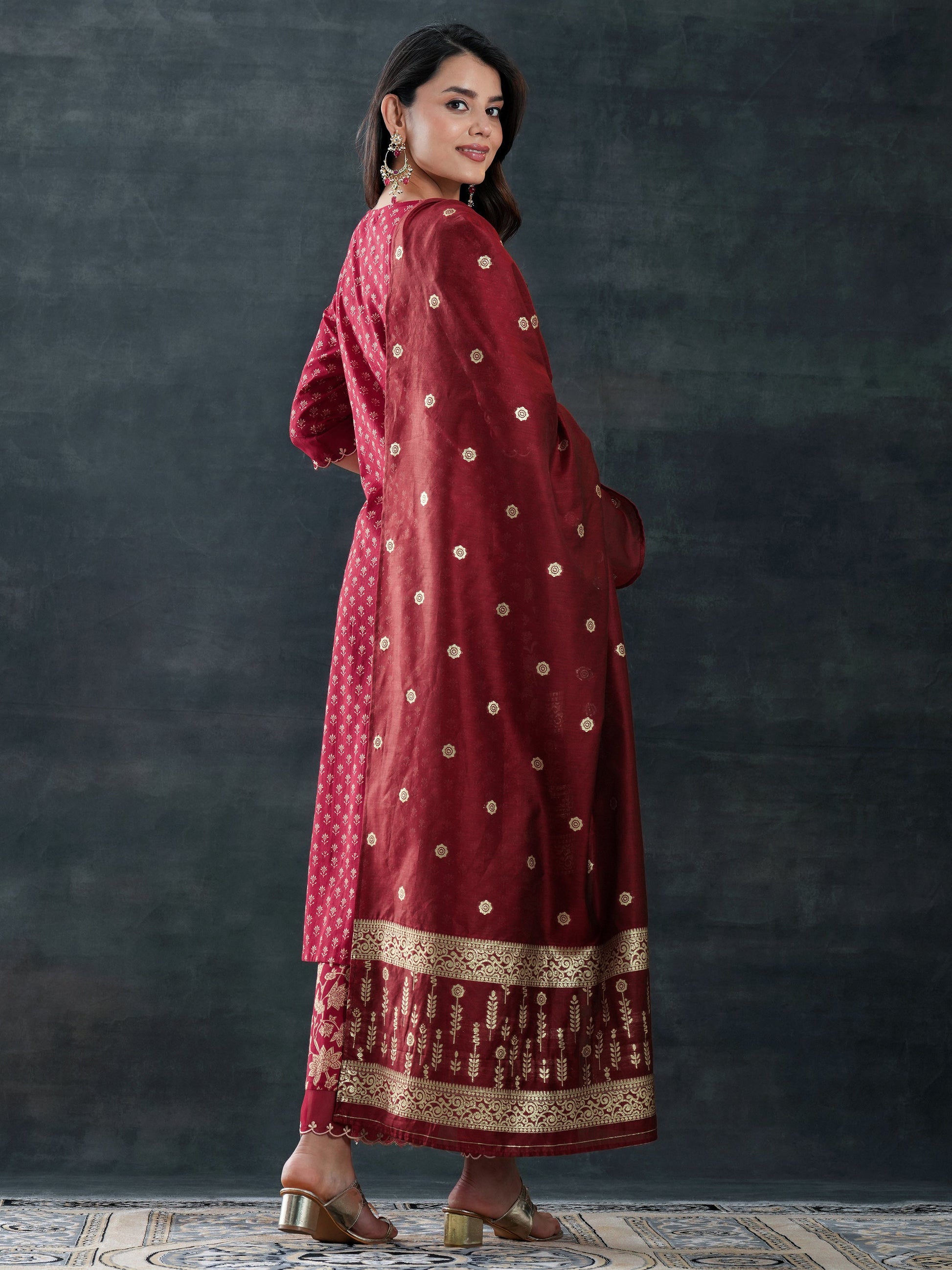 Maroon Woven Design Cotton Straight Suit Set With Dupatta