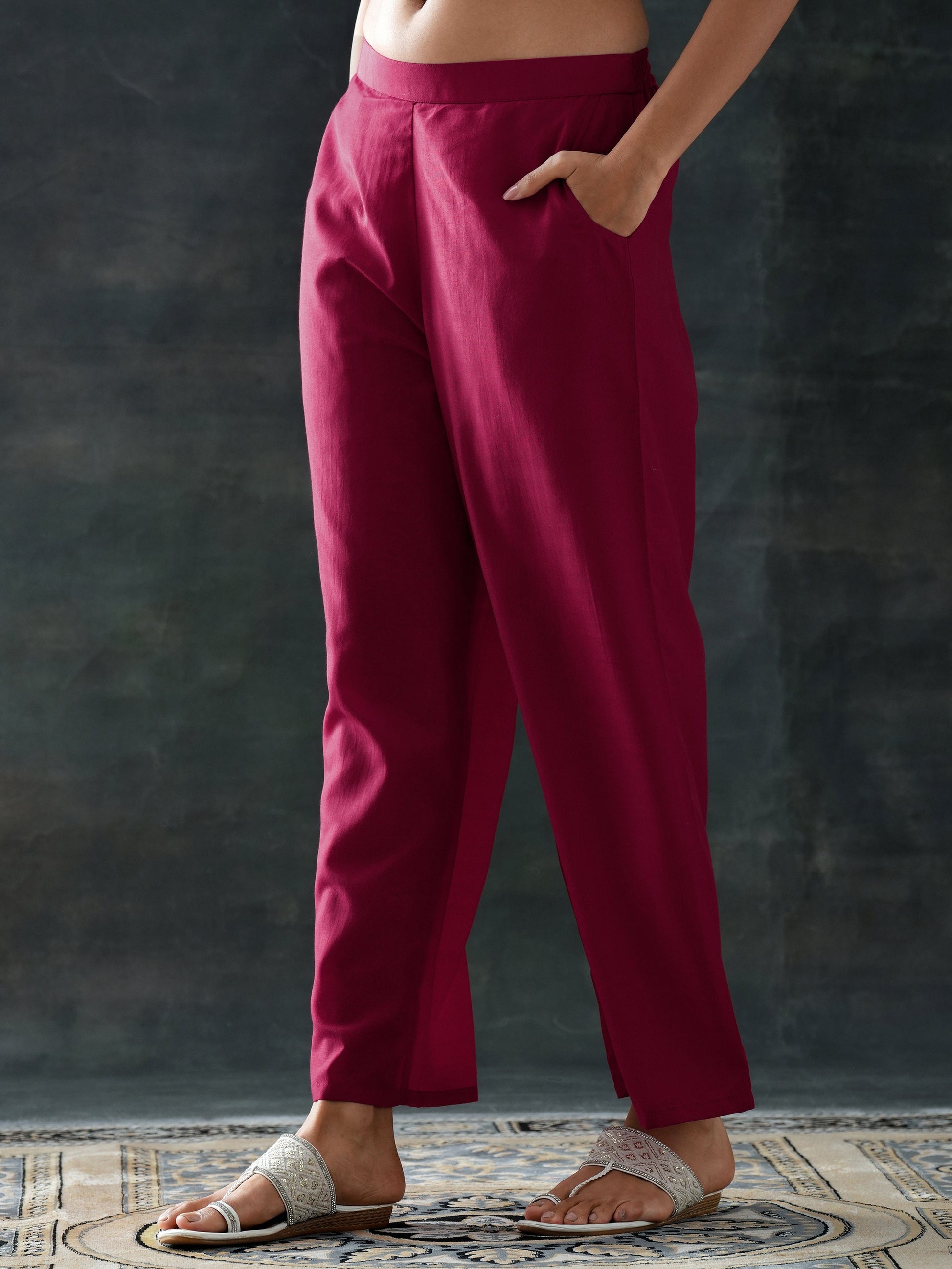Our 3-piece maroon silk blend Anarkali kurta set features a round neckline, regular sleeves, and a statement yoke. Complemented with lining and straight pants with a partially elasticated waistband and 2 pockets, and a printed dupatta. Adorned with woven design, this style is perfect for festive wear.