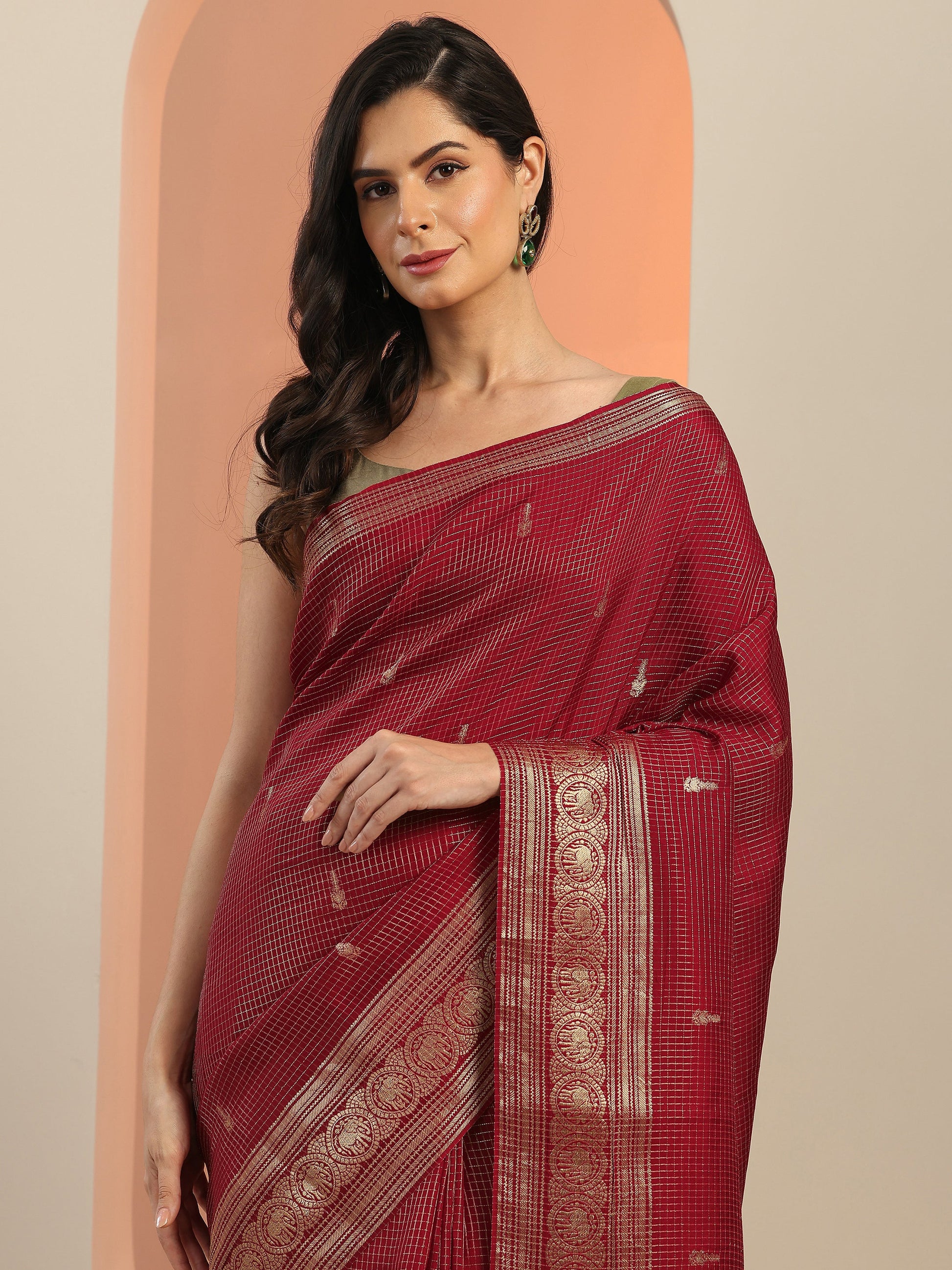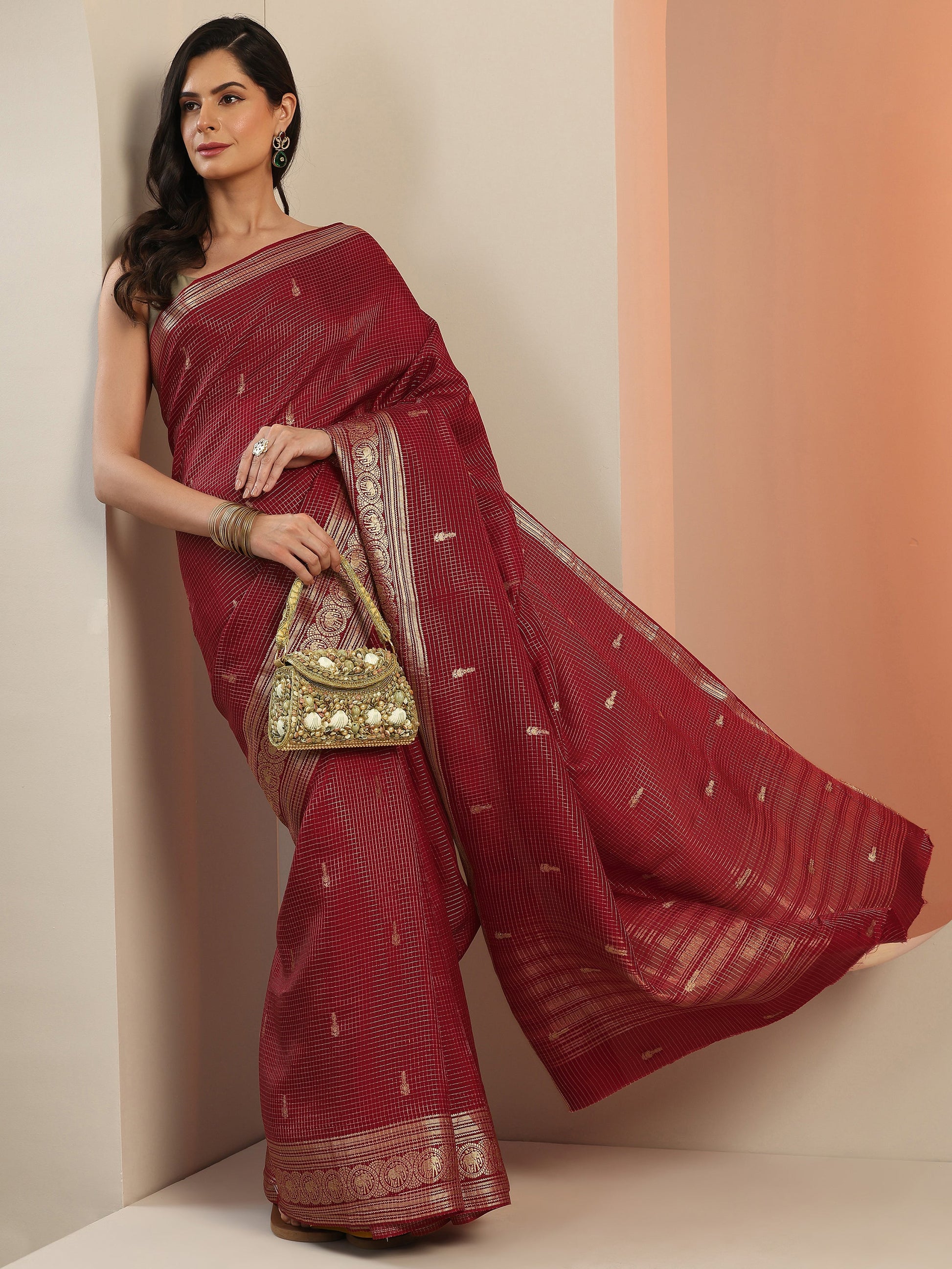 Maroon Woven Design Silk Blend Saree With Unstitched Blouse Piece