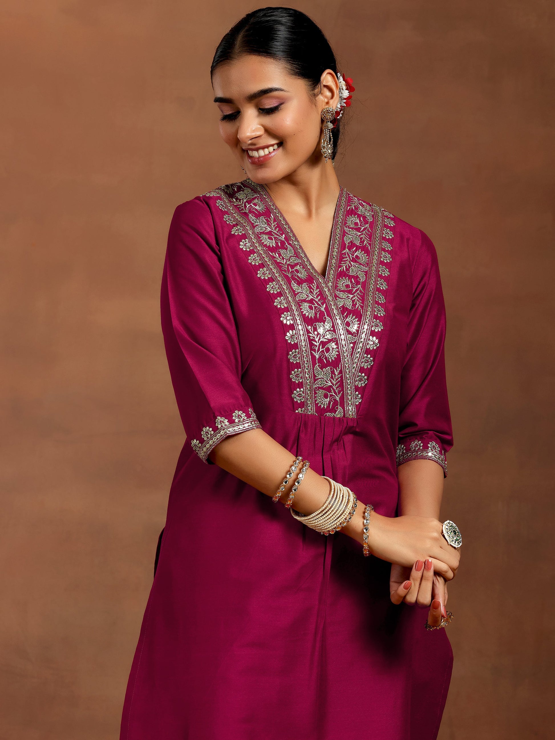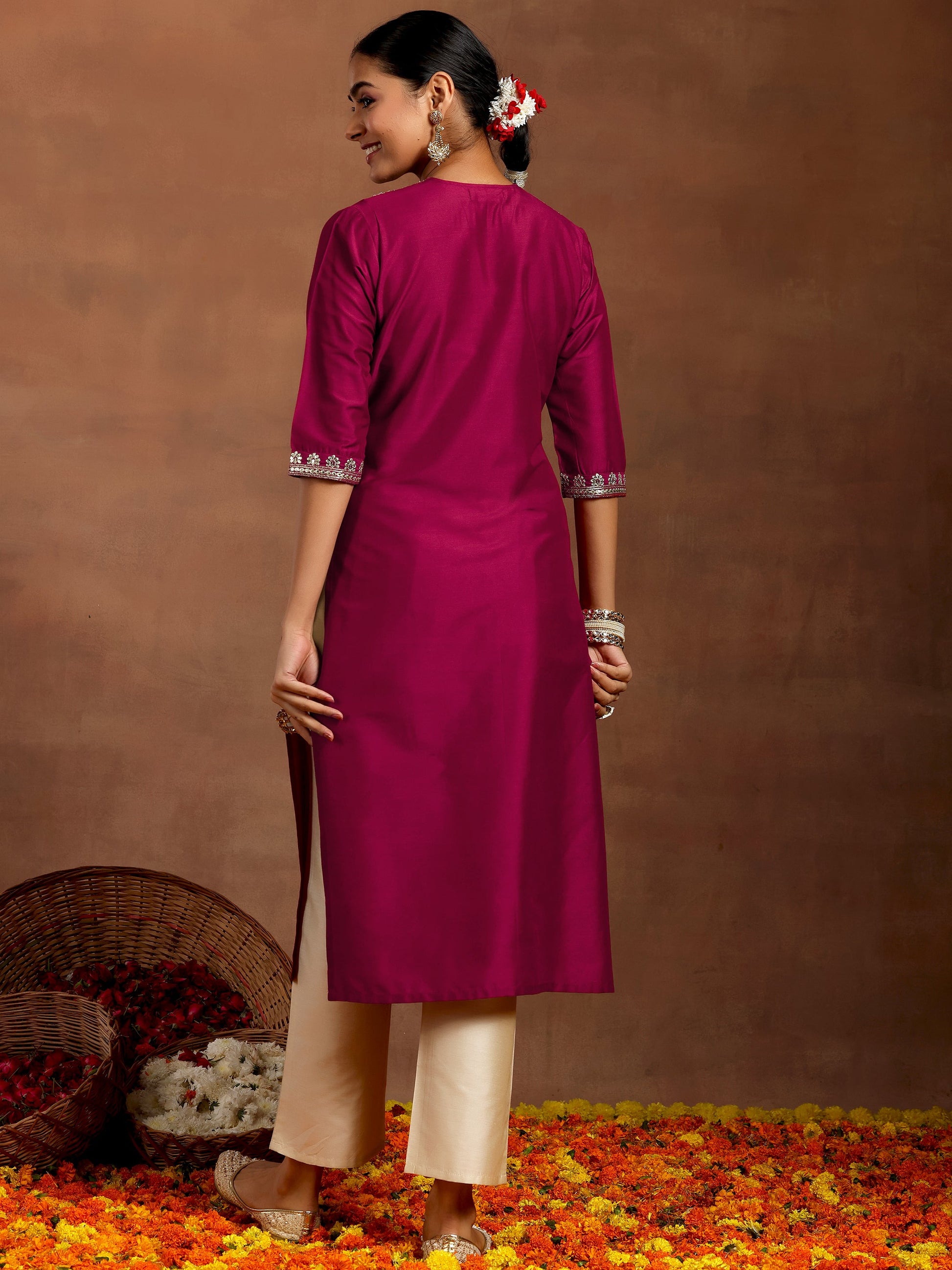 Our Magenta Silk features a Straight-fit Kurta with a V-neckline, Regular Sleeves. Adorned with Embroidered accents, this style is perfect for Dark Festive occasions.