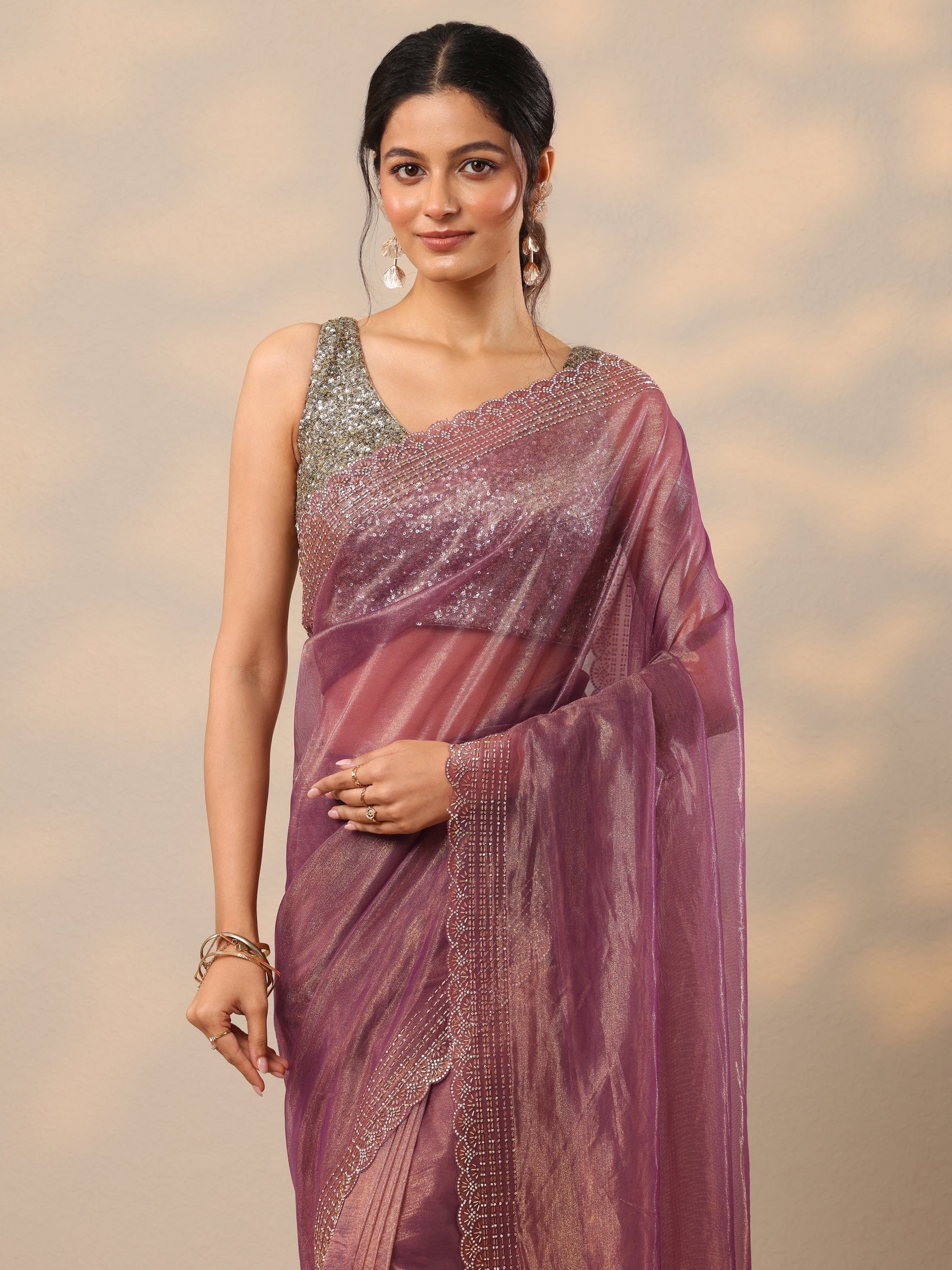Mauve Embellished Nylon Sarees With Unstitched Blouse Piece