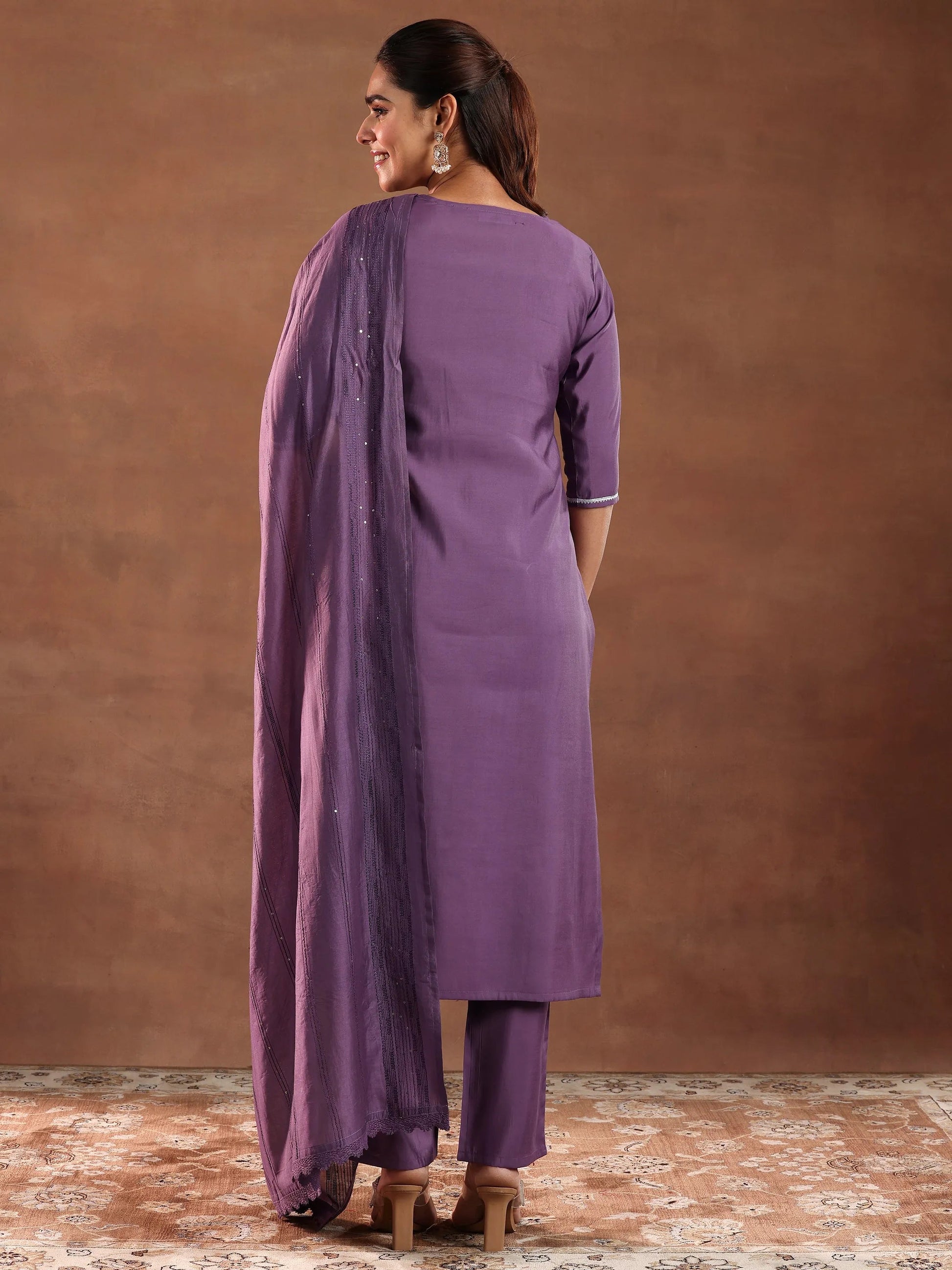 Mauve Embroidered Silk Blend Straight Suit With Dupatta