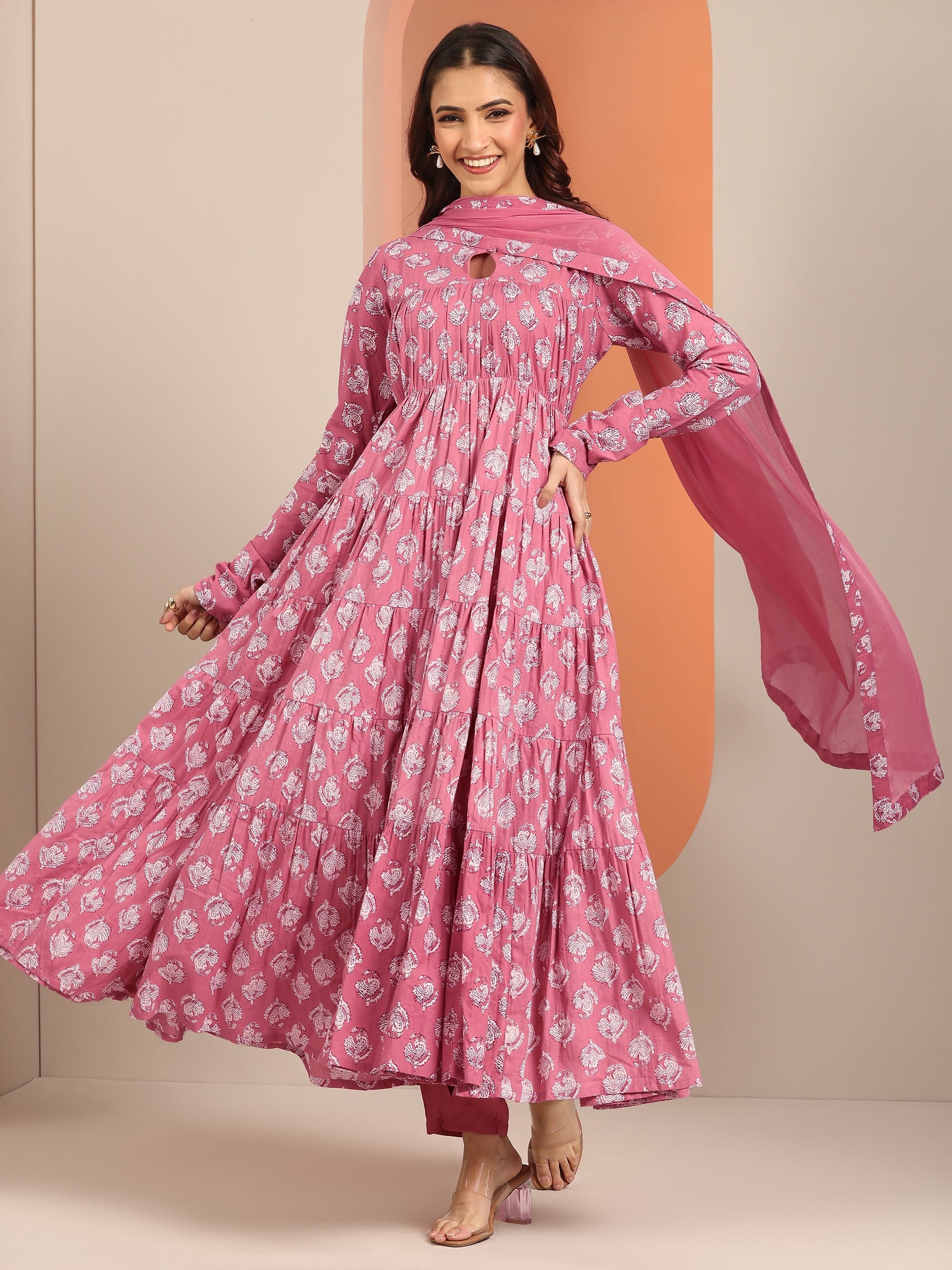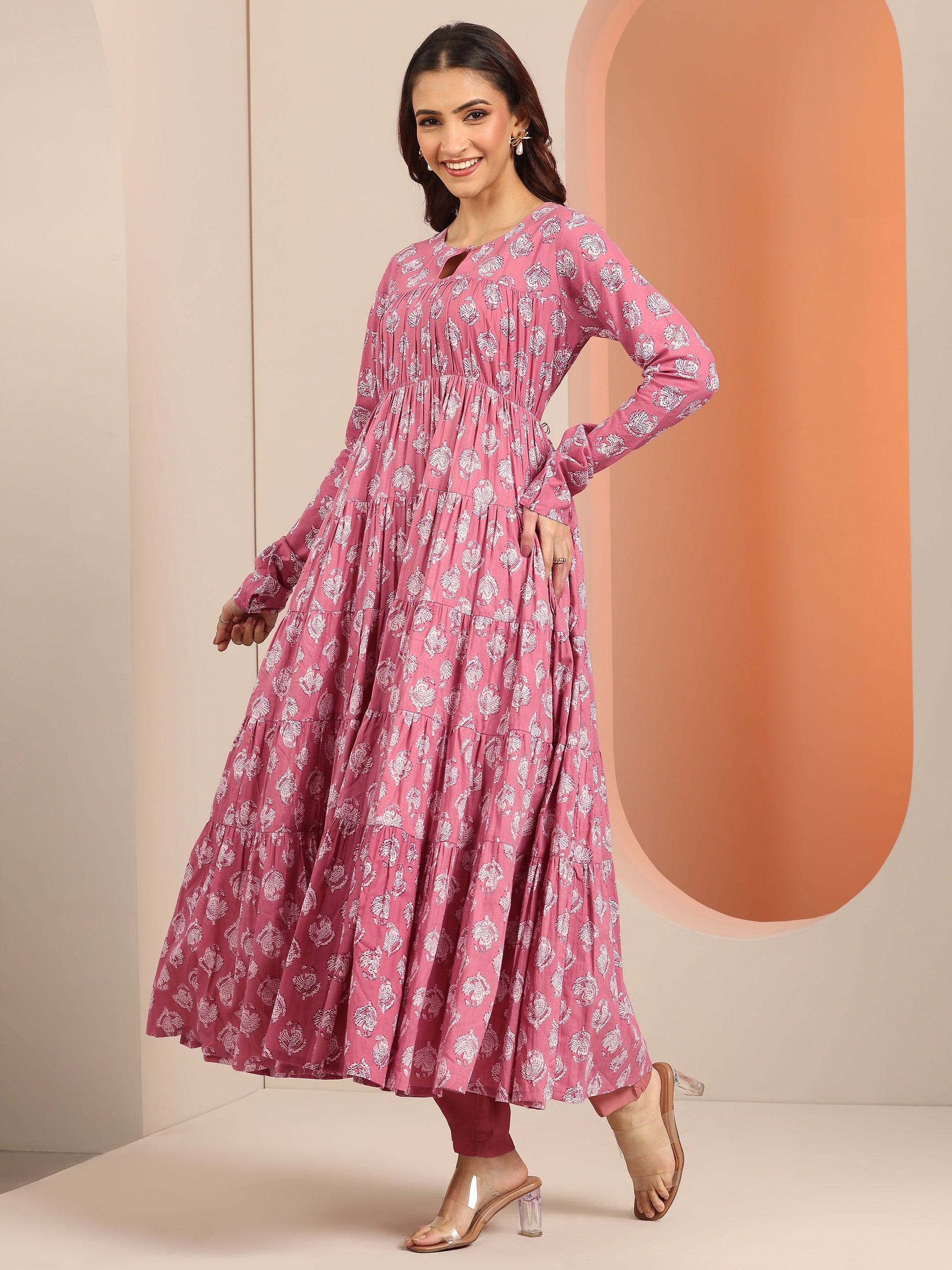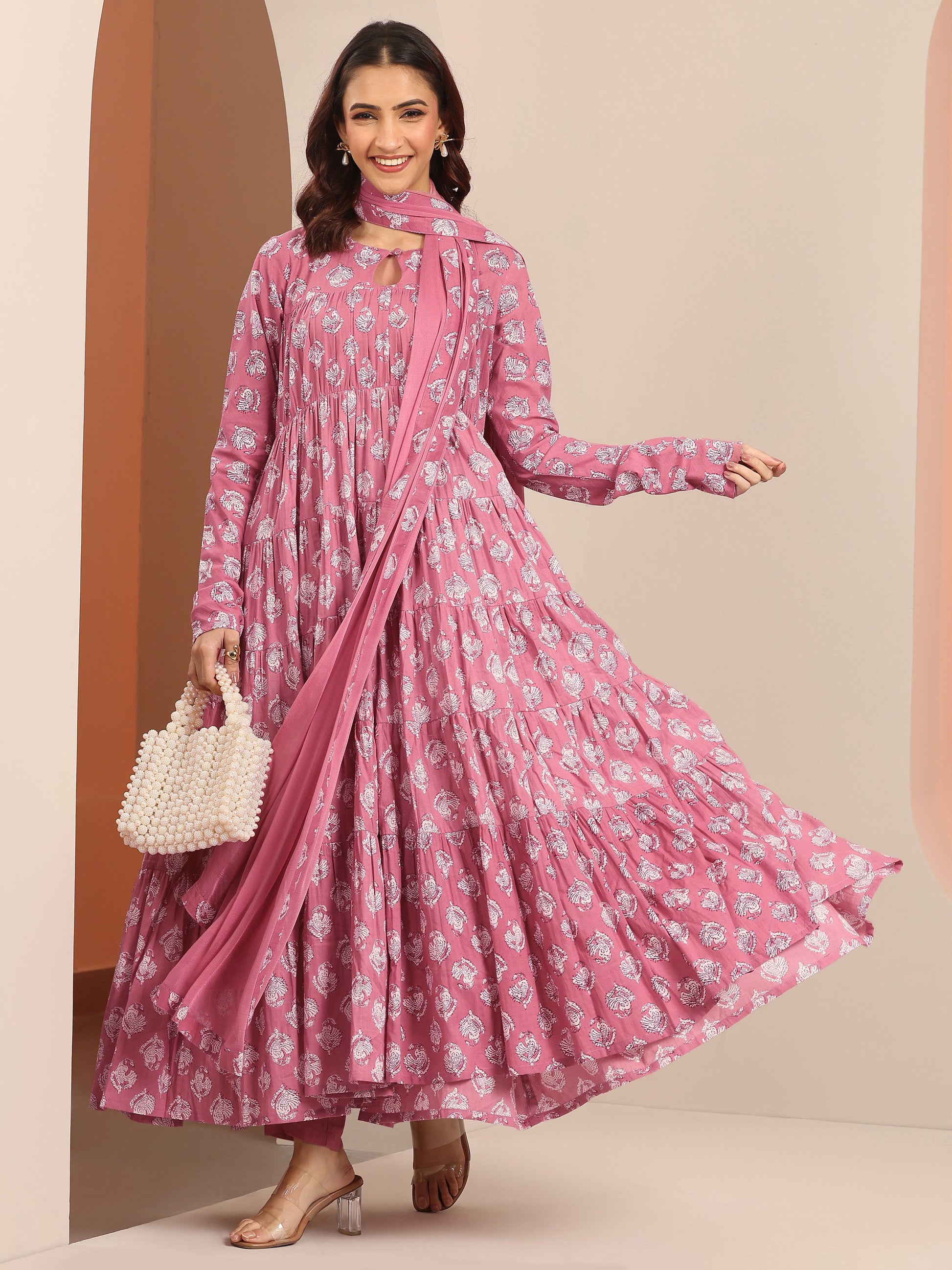 Mauve Printed Cotton Anarkali Suit Set With Dupatta