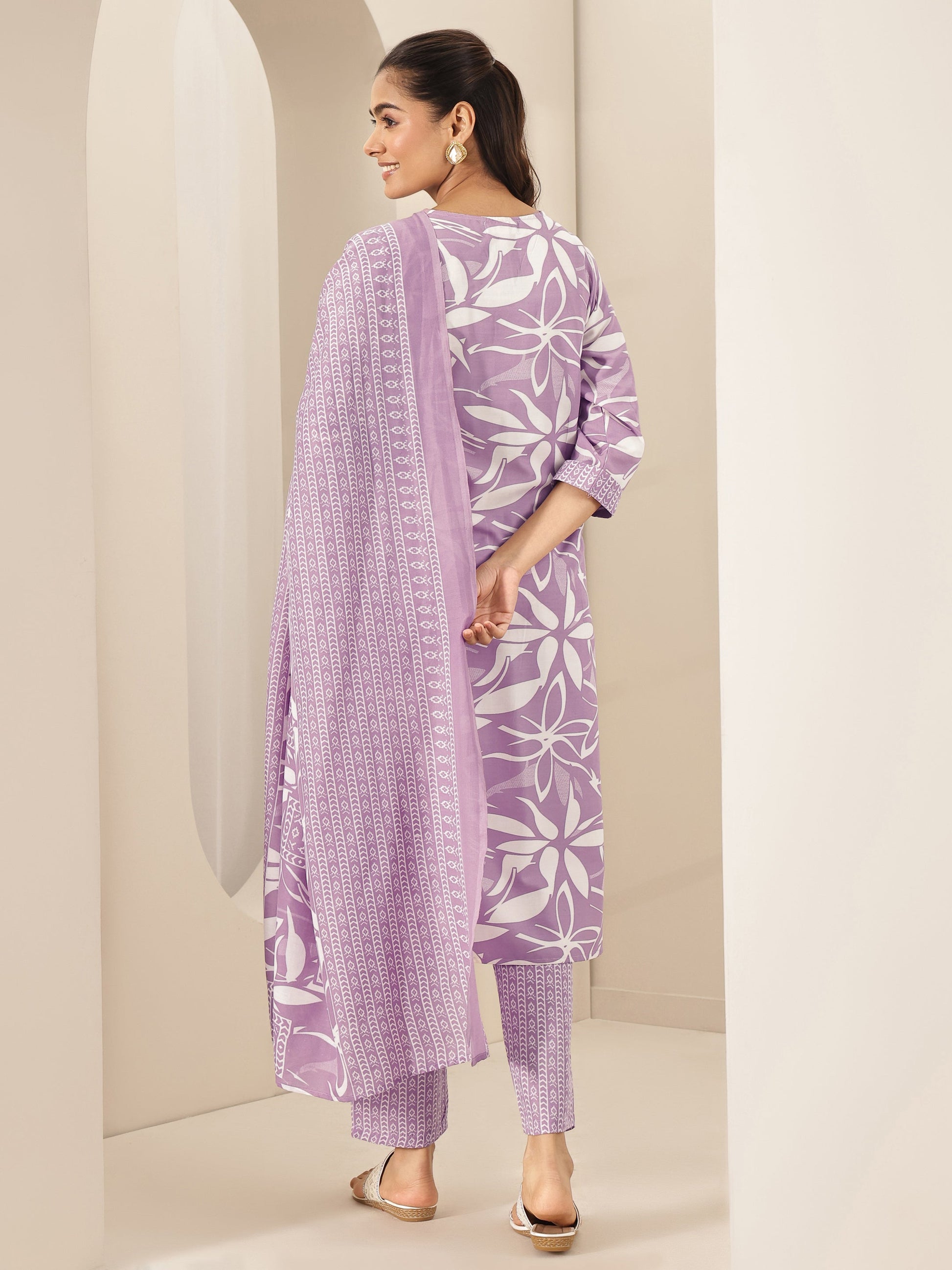 Our 3-piece lavender cotton blend straight-fit kurta set features a V-neckline, regular sleeves, and statement yoke. Complemented with straight pants with an elasticated waistband and 2 pockets, and a printed dupatta. Adorned with floral prints, this style is perfect for casual occasions.