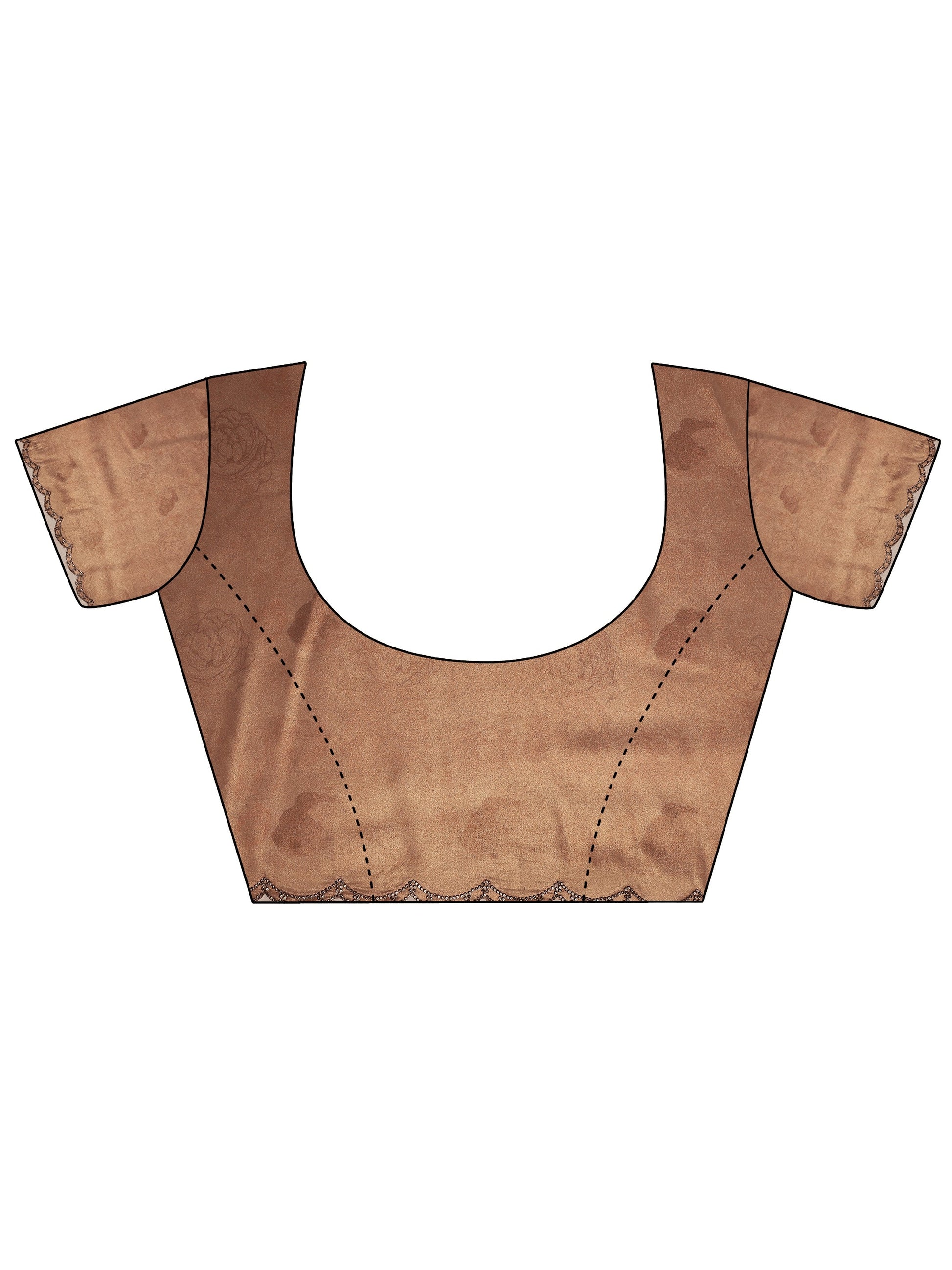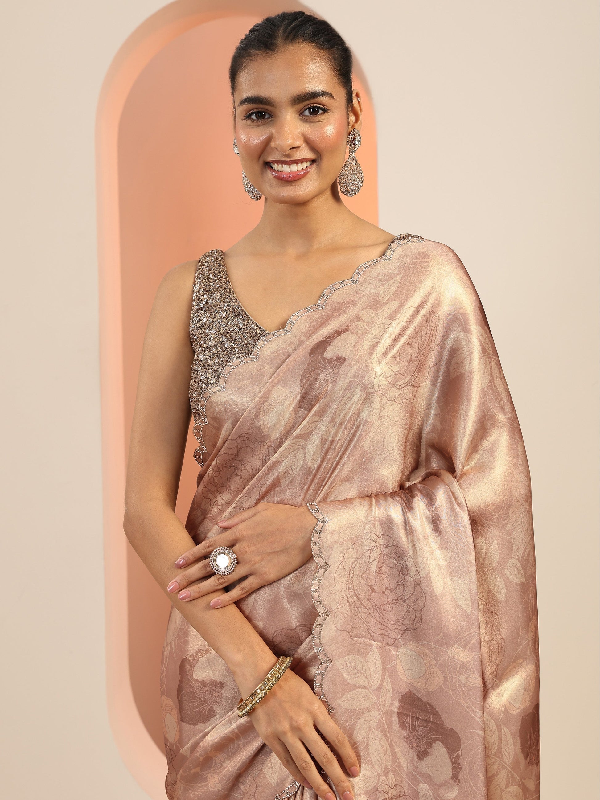 Our Beige Printed Satin Saree Features Captivating Floral Printed Design. Complemented With An Unstitched Blouse Piece. This Charming Saree Is Perfect For Festive Wear