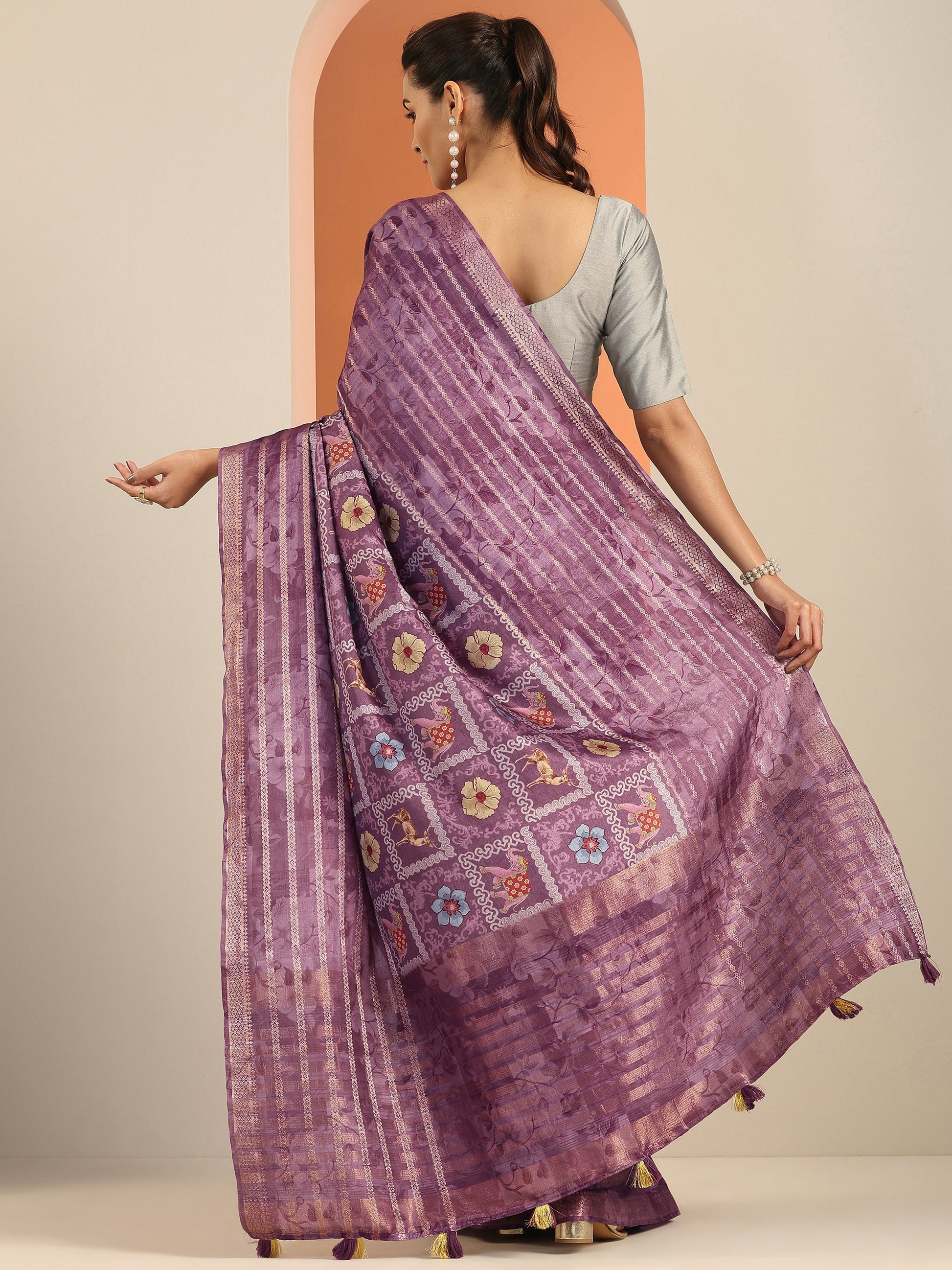 Our Purple Printed Silk Blend Saree Features Captivating Tribal Printed Design.Complemented With A Unstitched Blouse Piece. This Charming Saree Is Perfect For Festive Wear.