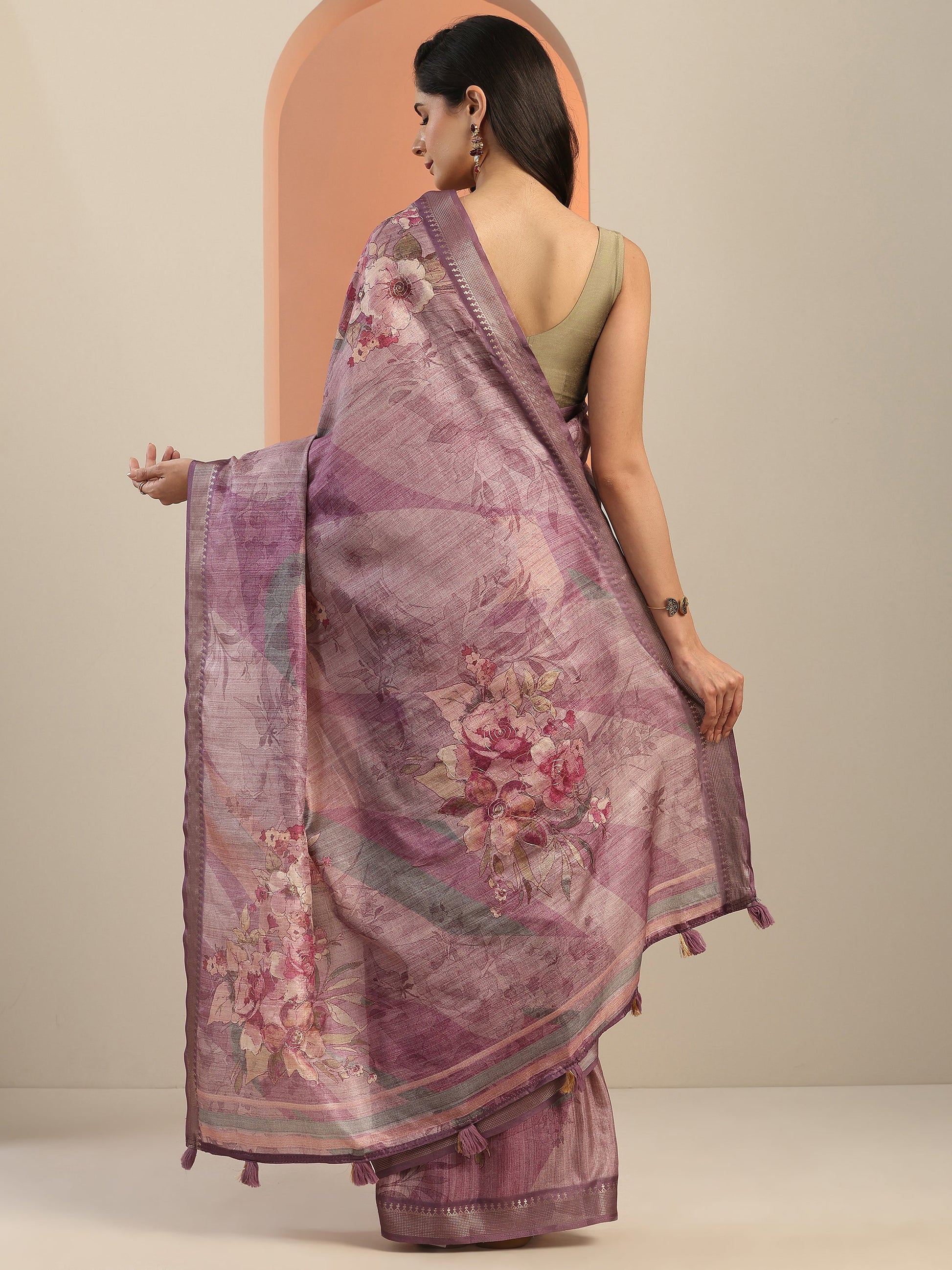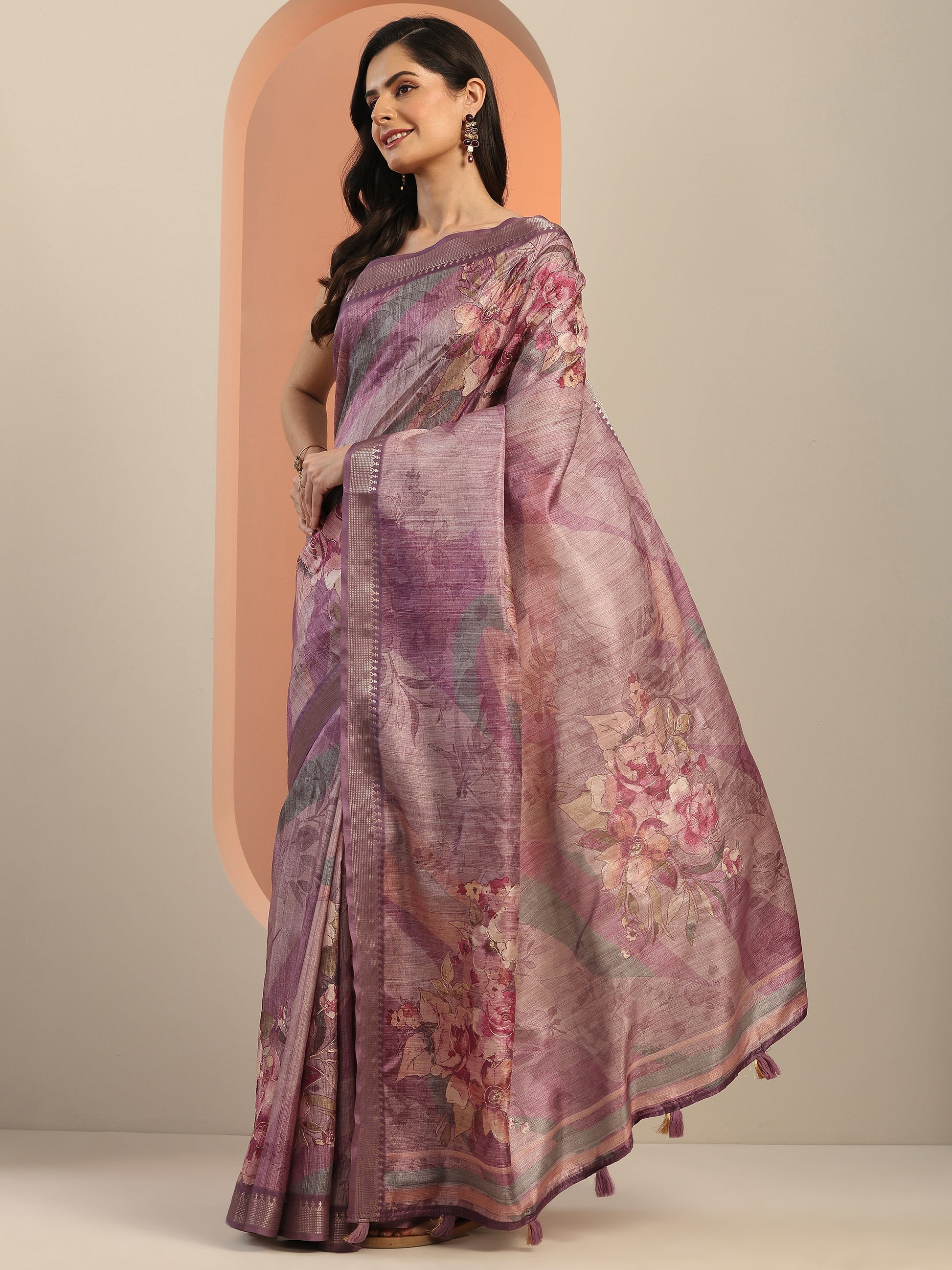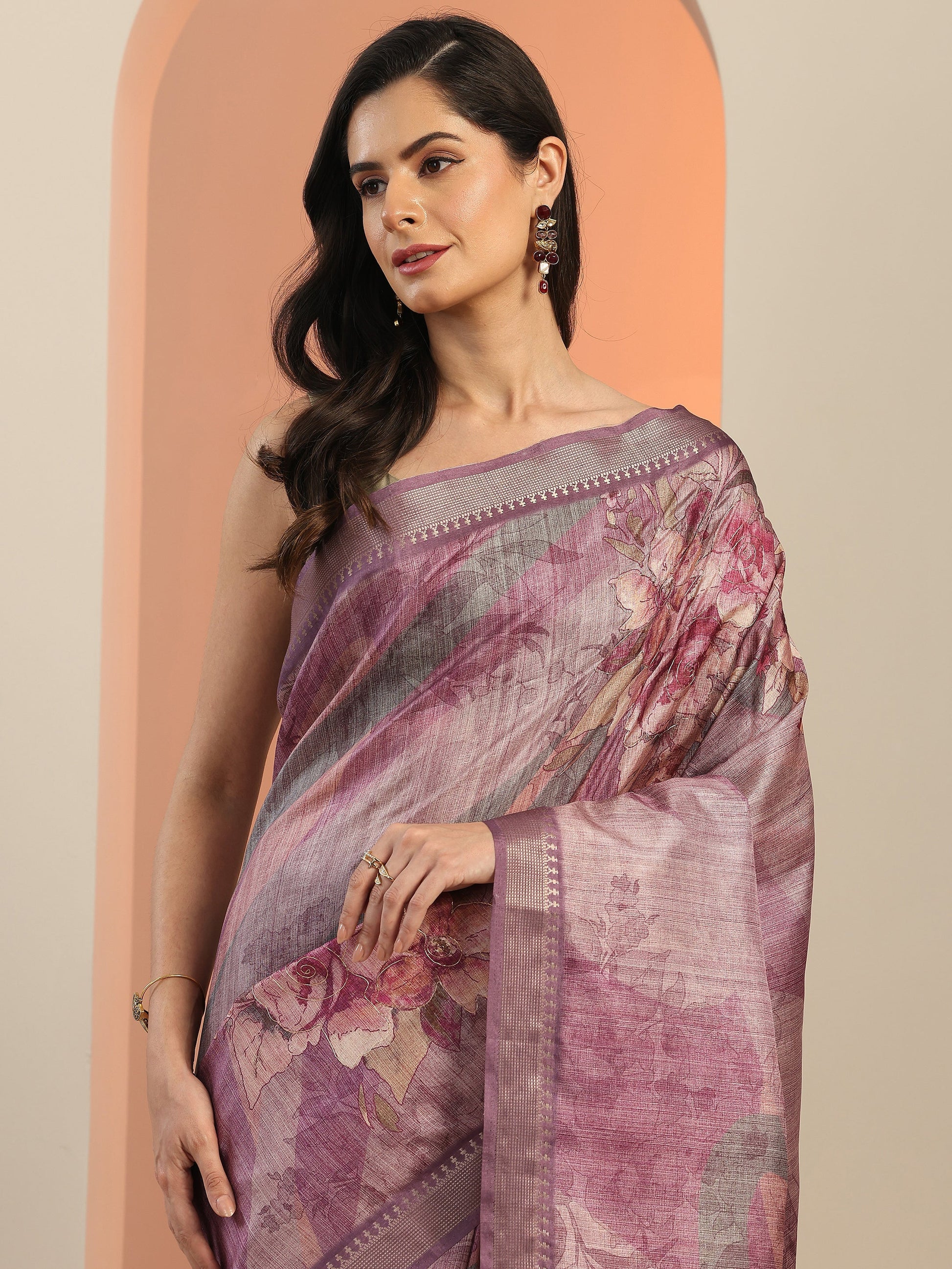 Our Mauve Printed Silk Blend Saree Features Captivating Woven Design. Complemented With A Unstitched Blouse Piece. This Charming Saree Is Perfect For Festive Wear.