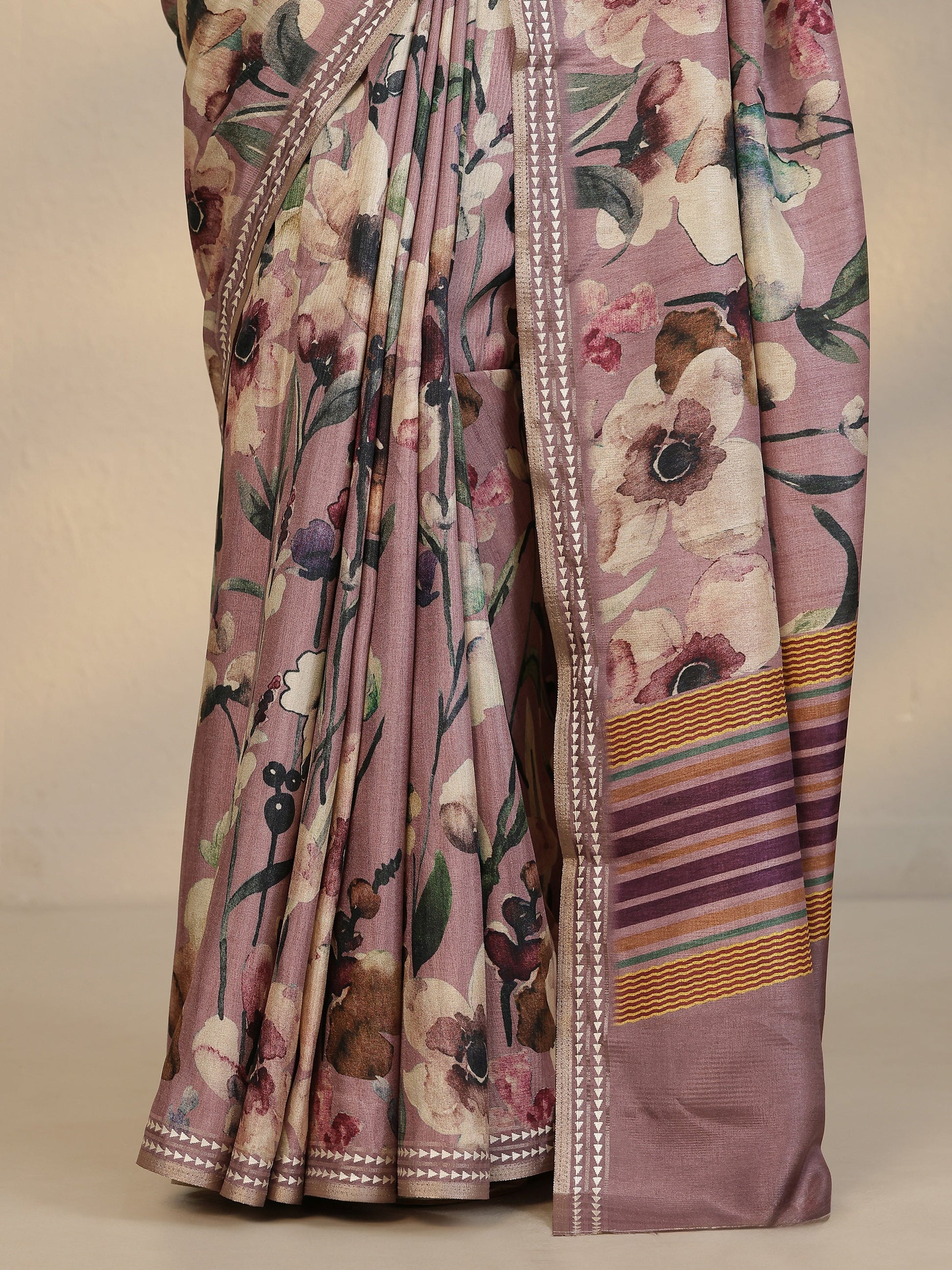 Mauve Printed Silk Blend Saree With Unstitched Blouse Piece