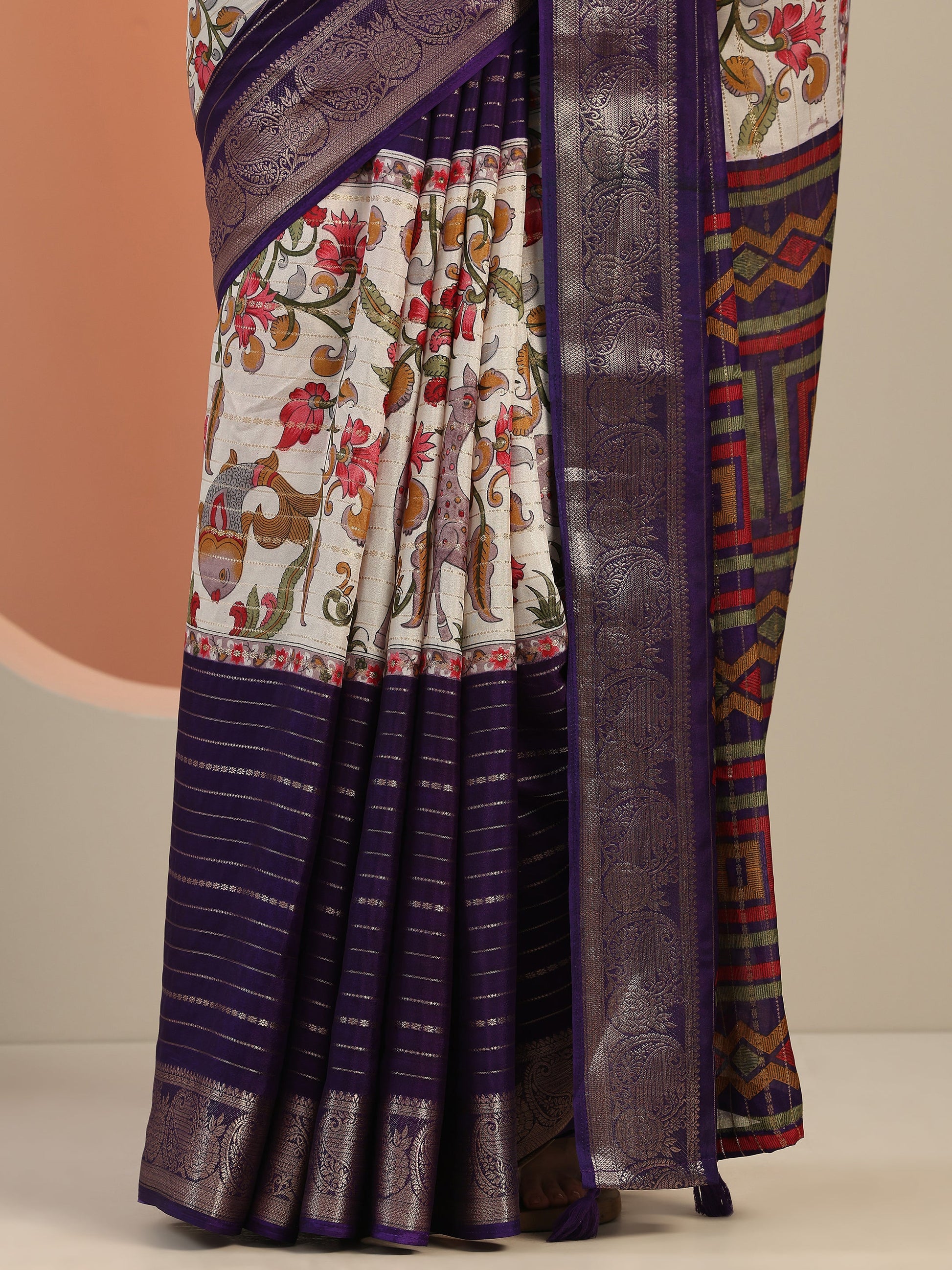 Our Purple Printed Crepe Saree Features Captivating Woven Design. Complemented With A Unstitched Blouse Piece. This Charming Saree Is Perfect For Festive Wear.