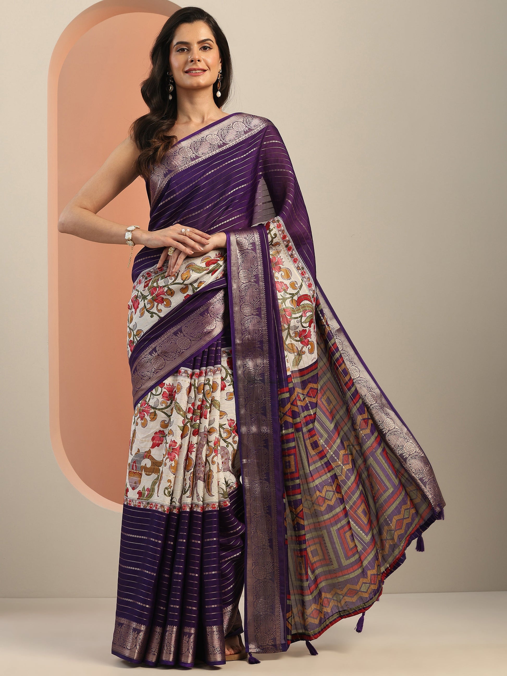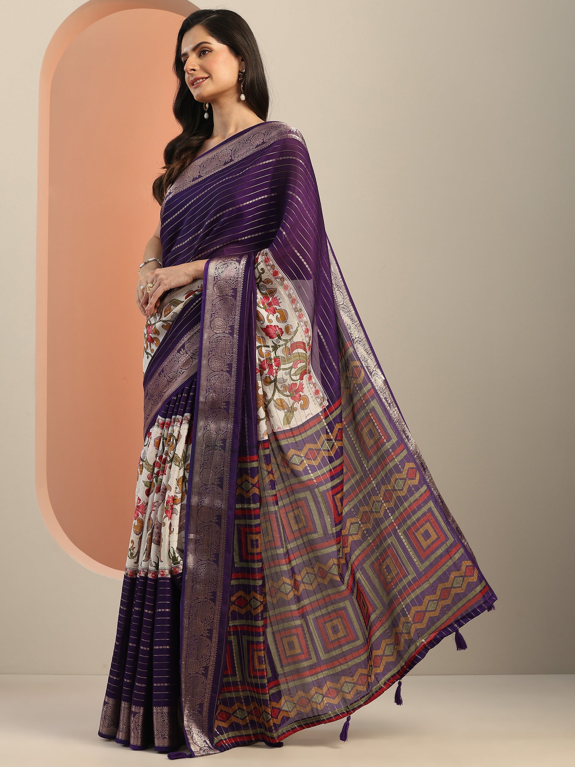 Our Purple Printed Crepe Saree Features Captivating Woven Design. Complemented With A Unstitched Blouse Piece. This Charming Saree Is Perfect For Festive Wear.