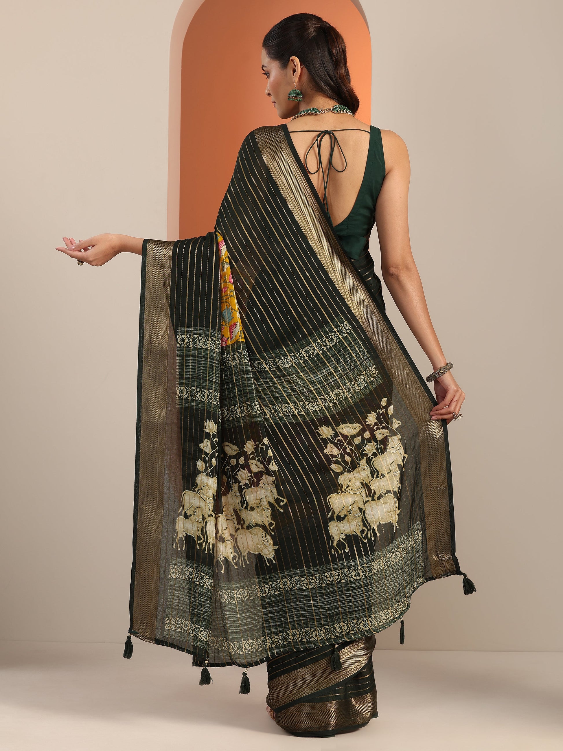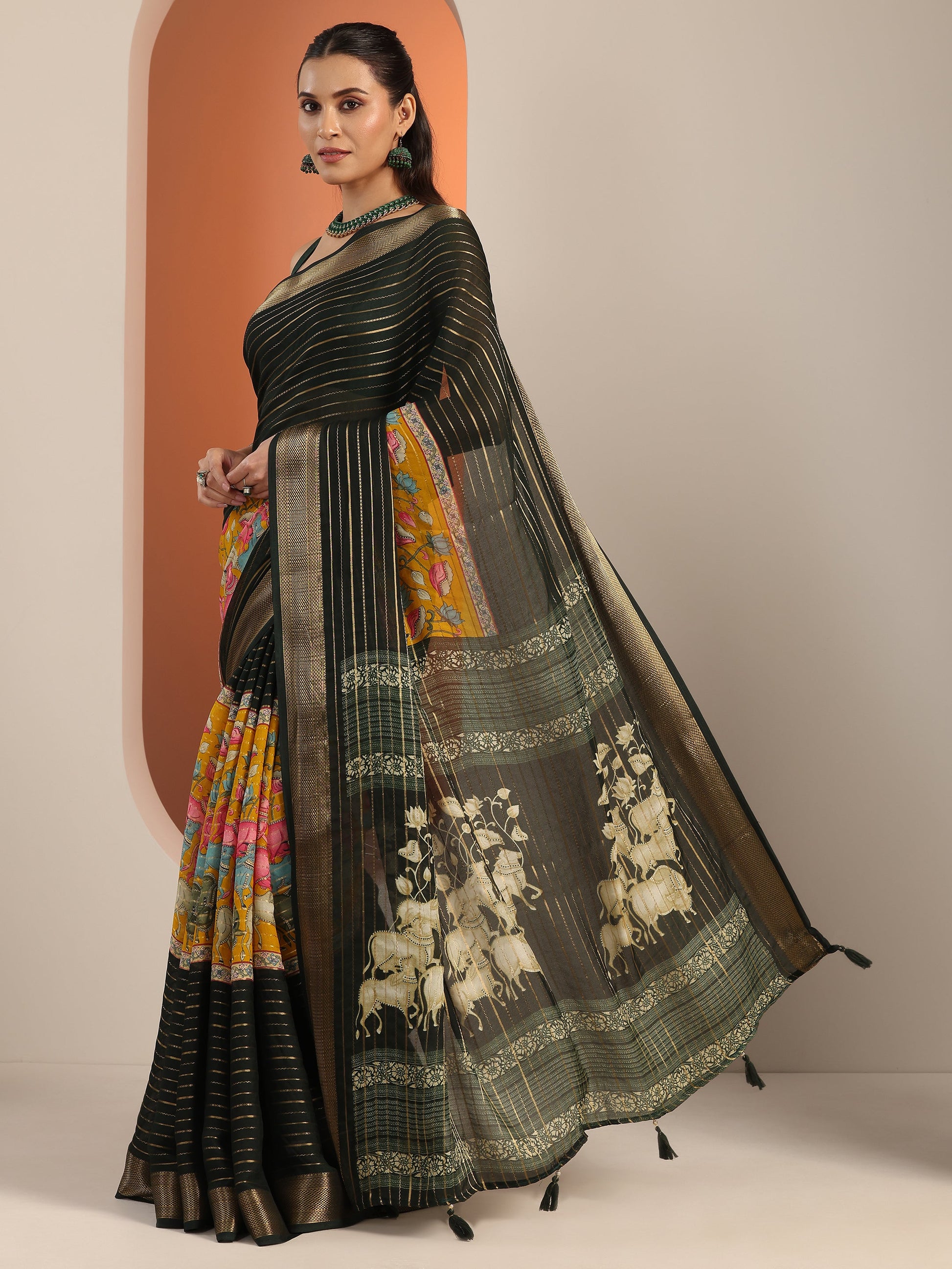 Our Yellow Printed Silk Blend Saree Features Captivating Woven Design. Complemented With A Unstitched Blouse Piece. This Charming Saree Is Perfect For Festive Wear.